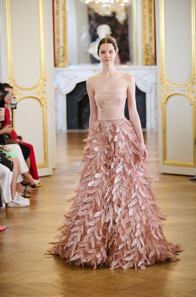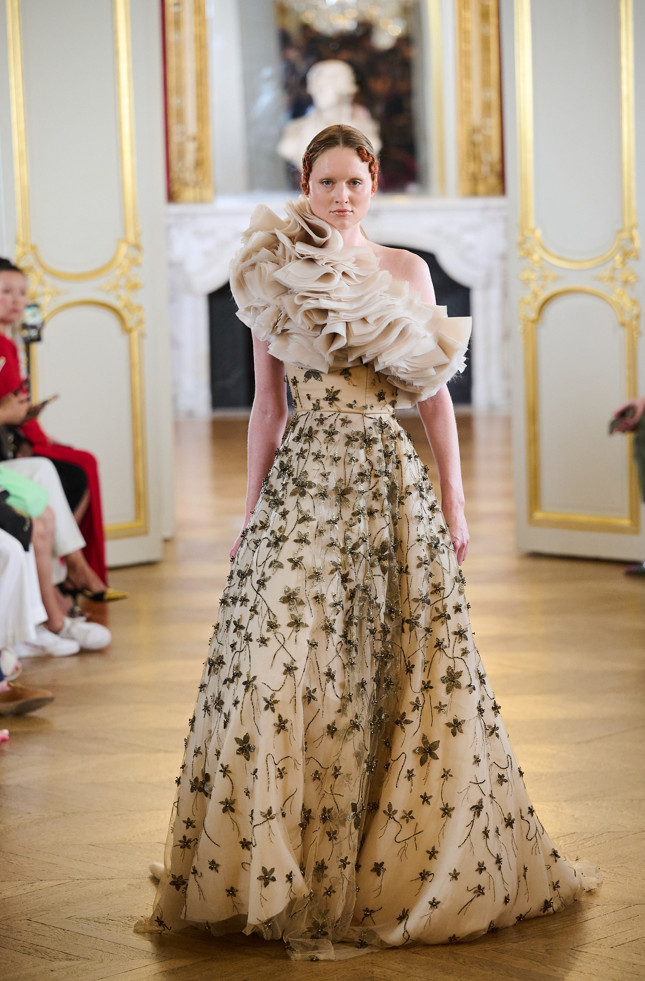 The cuts are mostly corseted dresses, full-length ball gowns, ruffles, feathers, embroidery with floral and nature-inspired details, and fitted fully embroidered dresses.