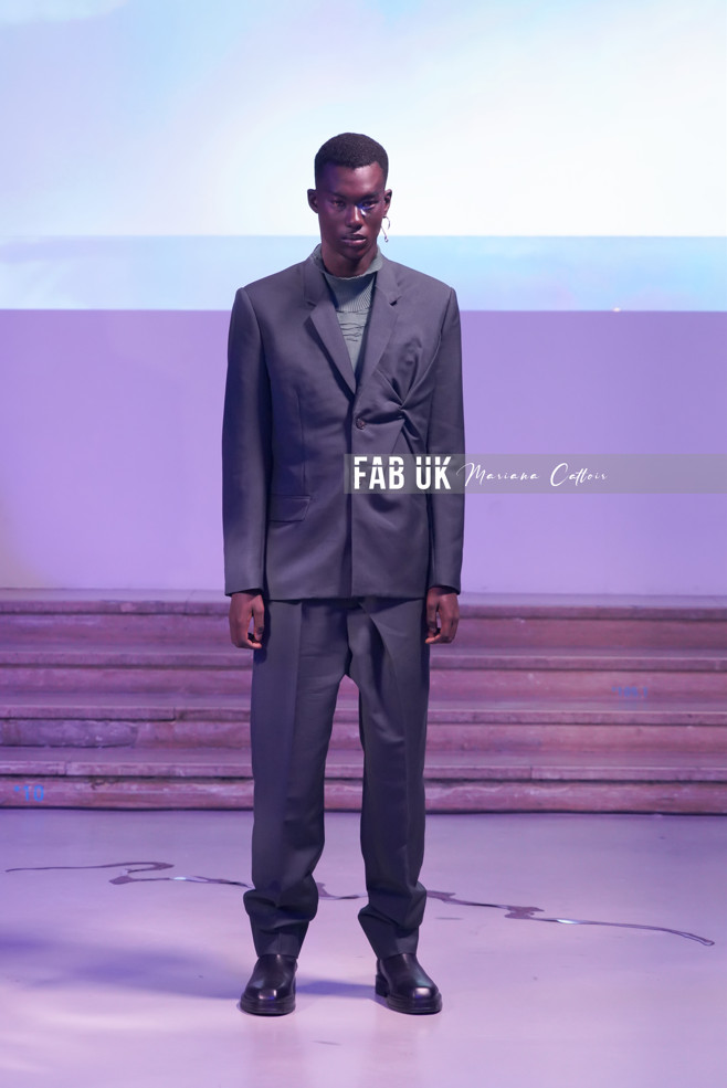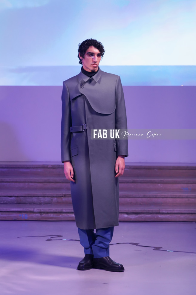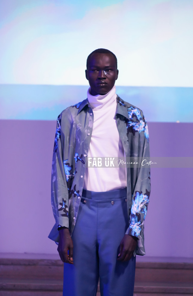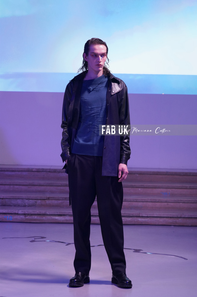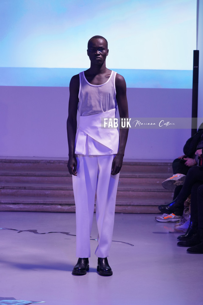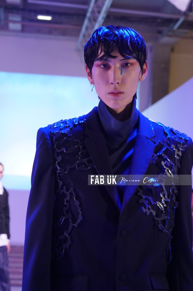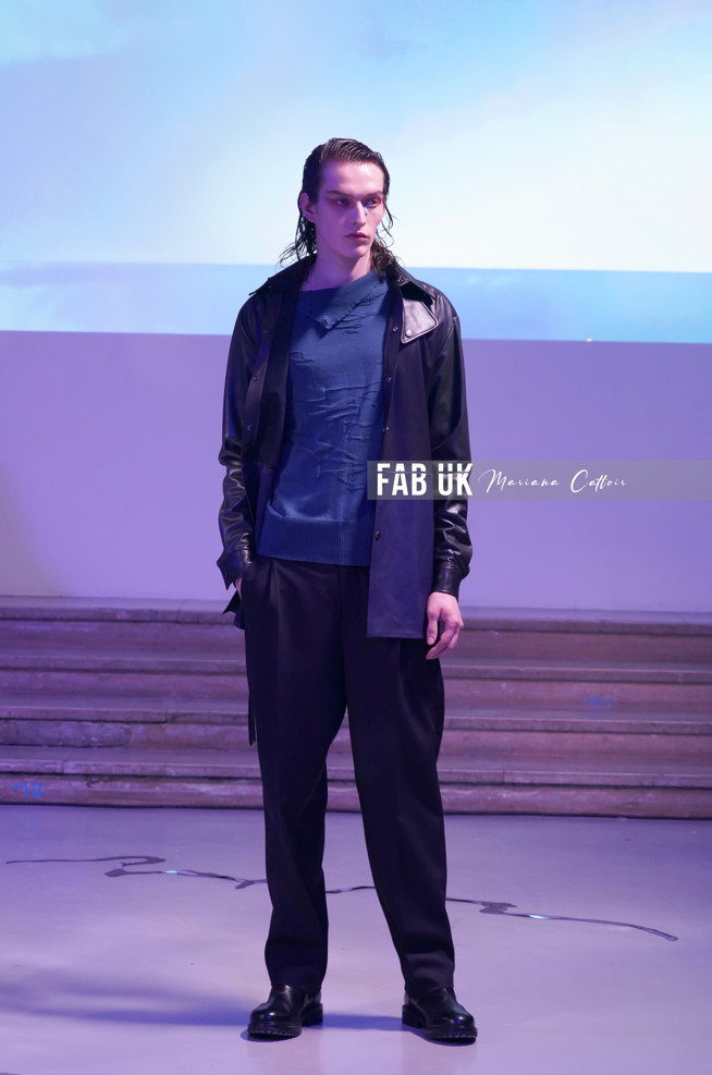 A deconstructed jacket with an open chest with tulle plissé suggests waves crashing onto the shores. As a result of constant research and mentoring, the collection is adorned with haute couture savoir-faire: hand-sewn embroidery, leather embellishment and organza silk layering.