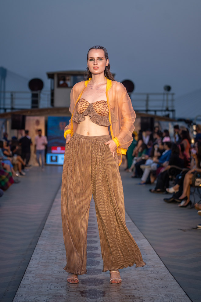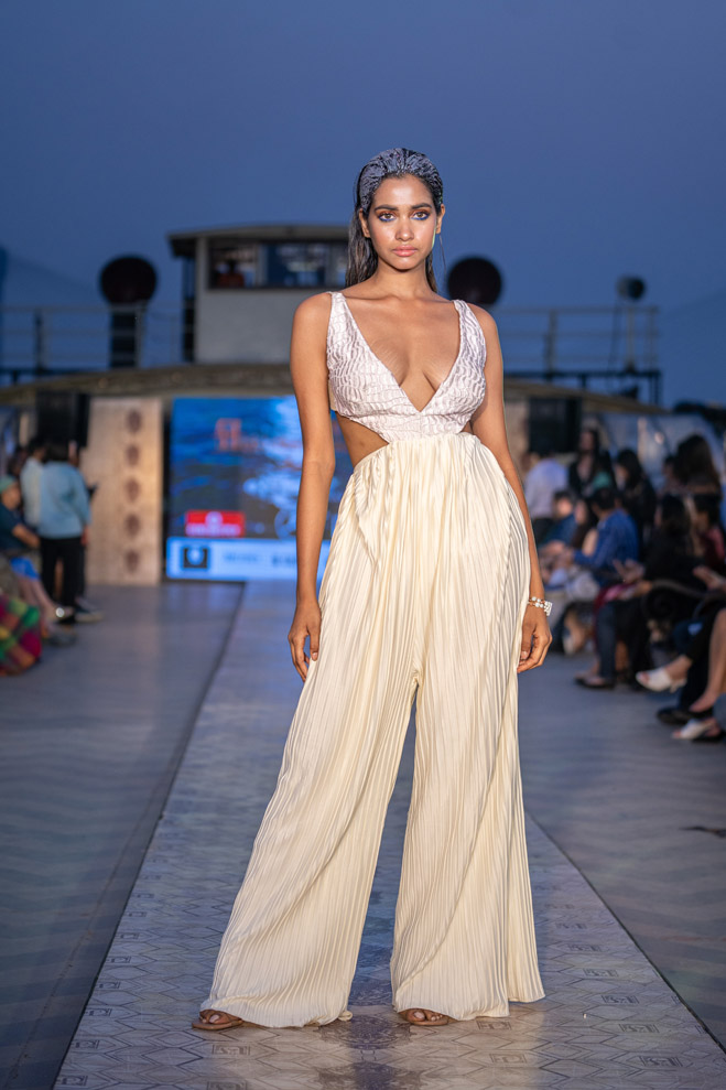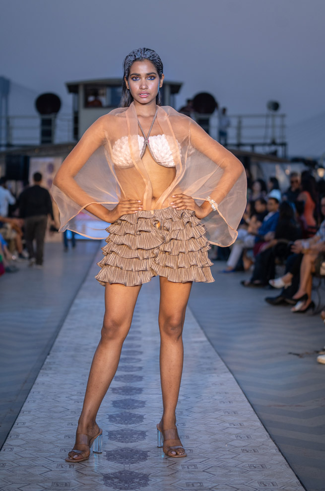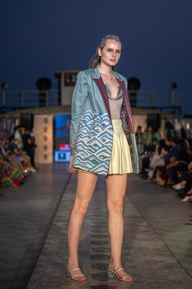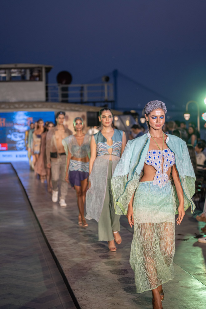 The collection titled “Immerse ” talks about polluting water bodies and a way to a better cleaner future through his sustainable line. The showcase was on a vintage resorted 1942 steame called Bengal Paddle which is one of the biggest private barges on the Ganges. The show featured a few of the best models from India and the showstopper for the show was EPR, the famous Indian rapper of mtv hustle fame. The event was in collaboration with Mercedes Benz who showcased their sustainable electric vehicle EQS.