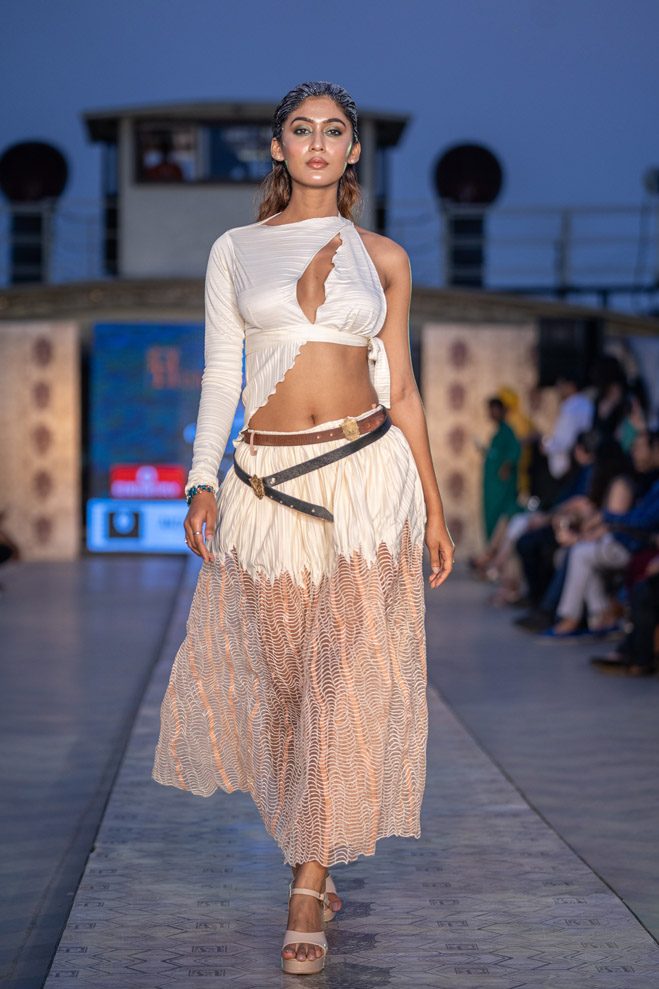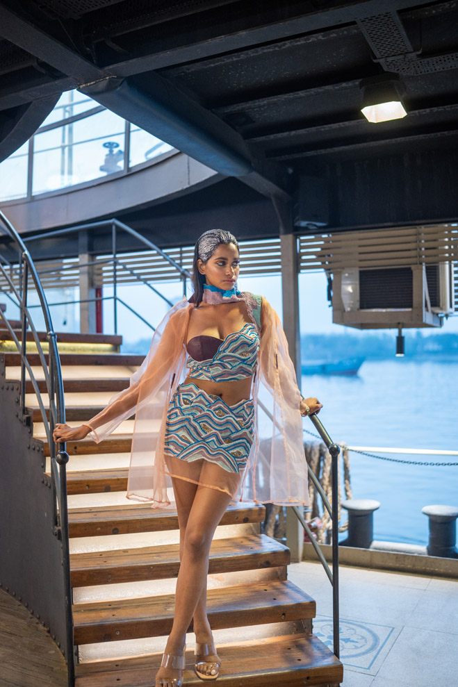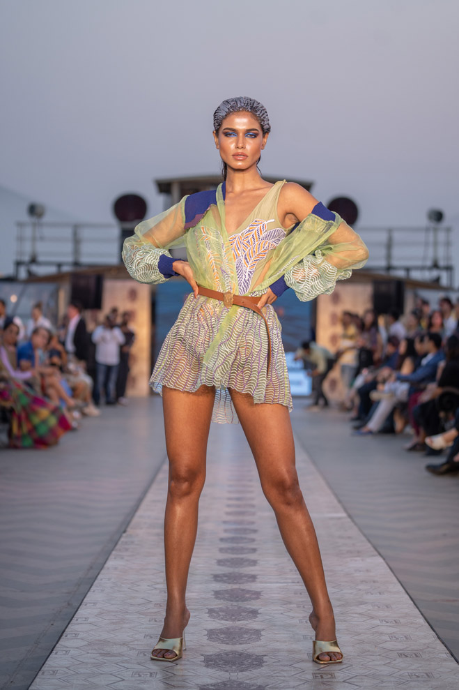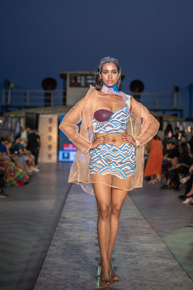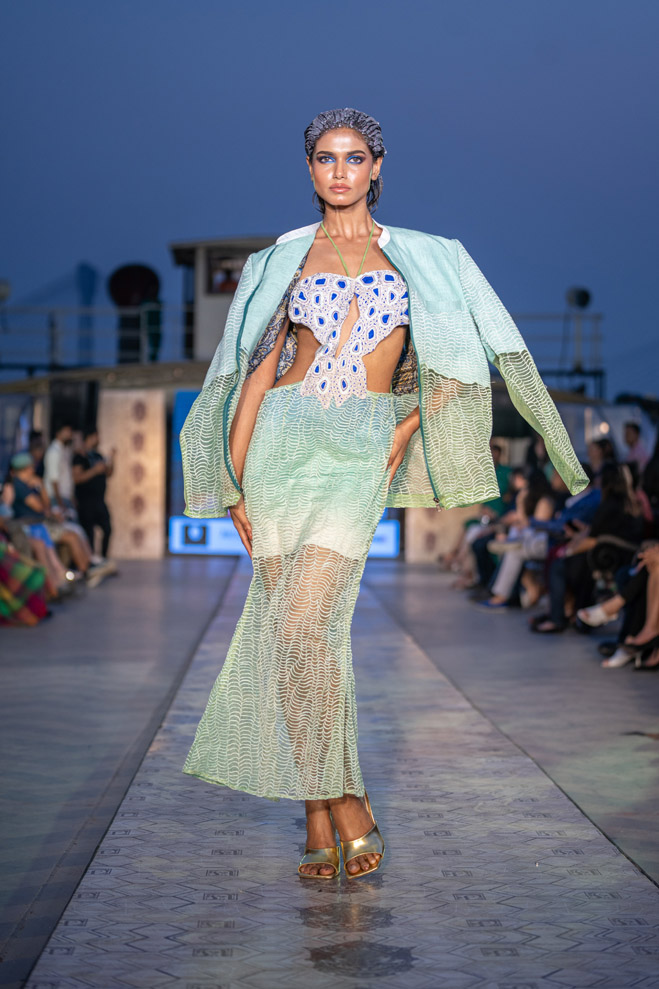 The collection titled “Immerse ” talks about polluting water bodies and a way to a better cleaner future through his sustainable line. The showcase was on a vintage resorted 1942 steame called Bengal Paddle which is one of the biggest private barges on the Ganges. The show featured a few of the best models from India and the showstopper for the show was EPR, the famous Indian rapper of mtv hustle fame. The event was in collaboration with Mercedes Benz who showcased their sustainable electric vehicle EQS.