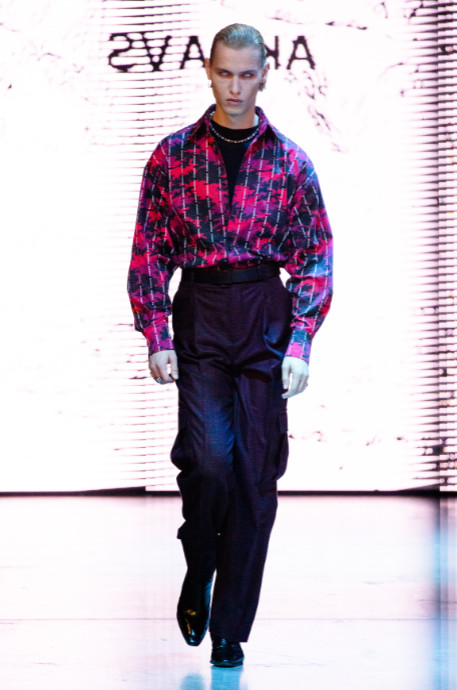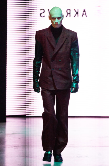 Closing off the day was an environment-conscious collection, accompanied by an art film – SVARKA brought the guests into its own dark little world, filled with vampiric teenagers in a warehouse rave setting. The collection itself could also be called rave-inspired, bringing to mind the opening scenes of the vampire slasher movie ‘Blade’. Dark crimson shirts and jumpers, blood-red checkered jackets and classic rave essentials like psychedelic lycra shirts with a high collar – it was all very Dracula goes to Amsterdam.