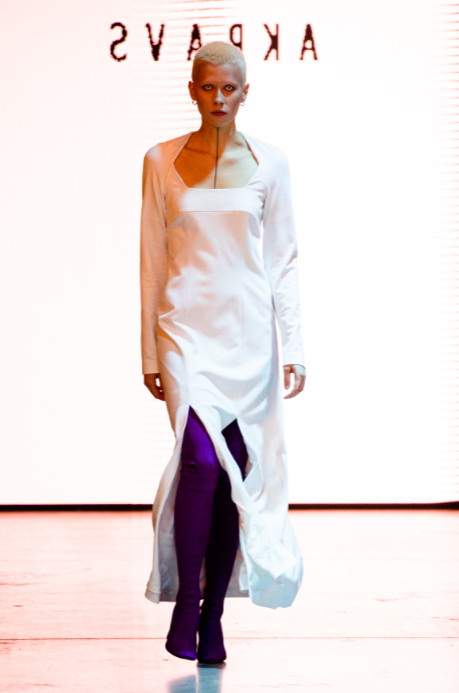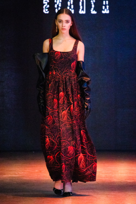 Accompanied by shoulder-high black faux leather gloves, leather boots and patterning that reminded one of the circulatory systems, this bloodthirsty collection was a perfect finisher to the second day of Mercedes-Benz Fashion Week Russia’s spooky Halloween fashion season.