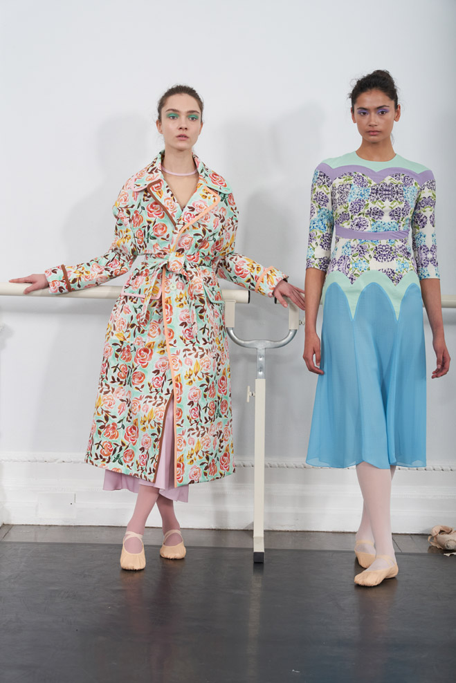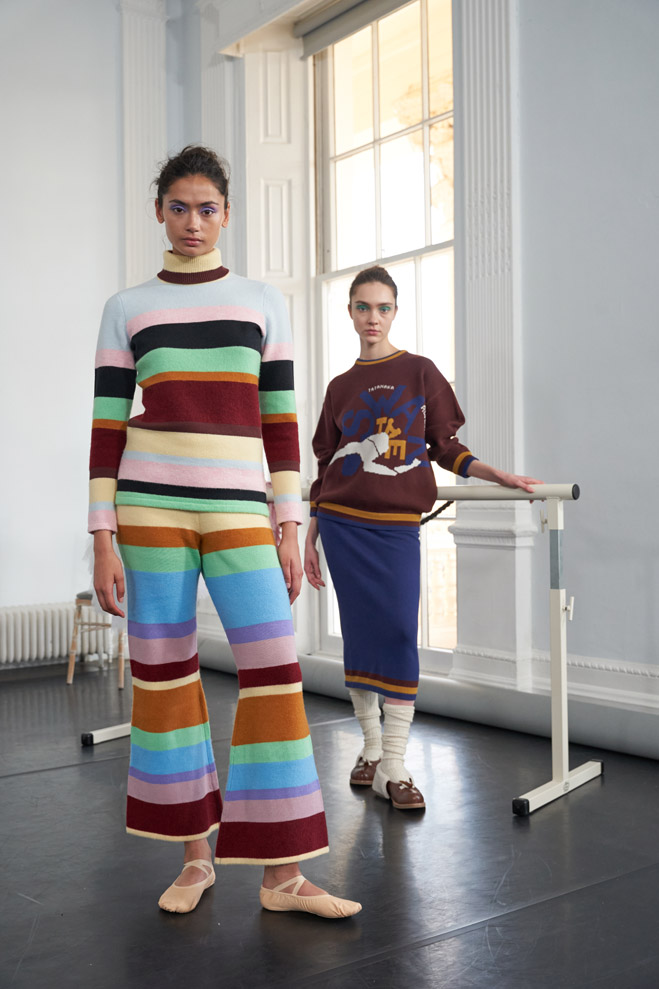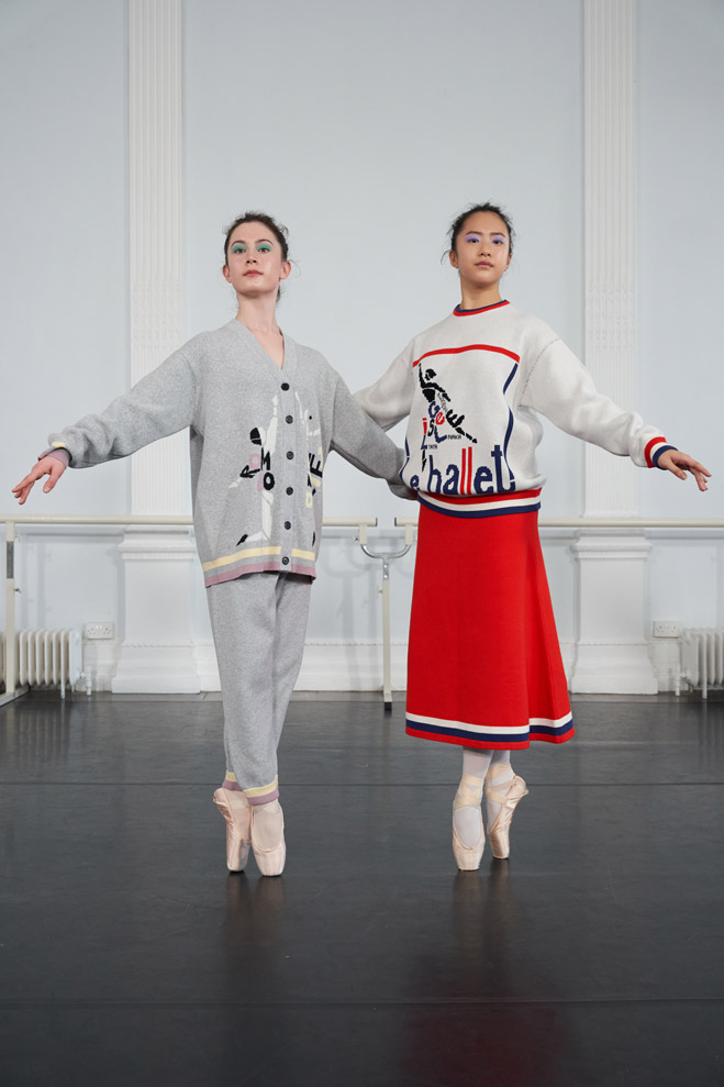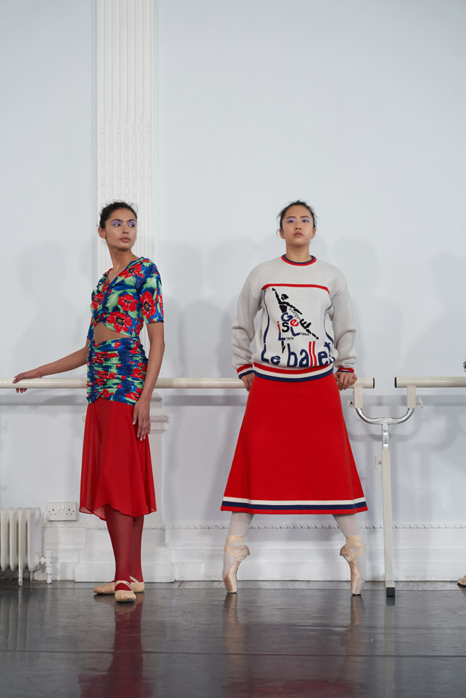Prints are inspired by the vintage-style florals often seen on leotard designs. The same motifs feature as beaded panels inserted in cut-out dresses and are also incorporated in soft cashmere pieces. A sportier sweatshirt-style range of jumpers showcases Tata Naka’s interpretation of Giselle, Romeo and Juliet and The Swan ballet posters.