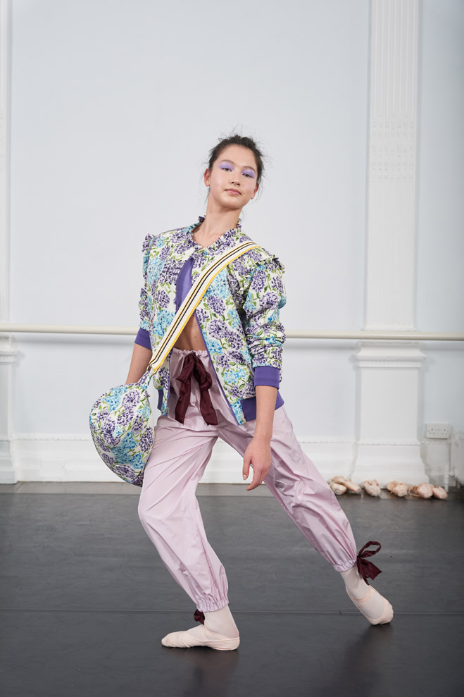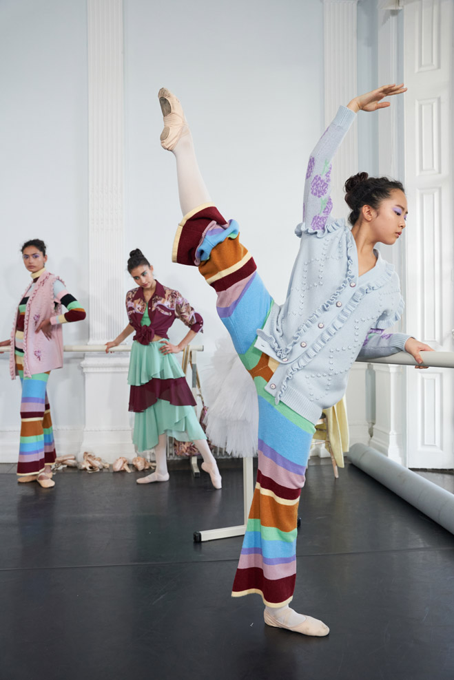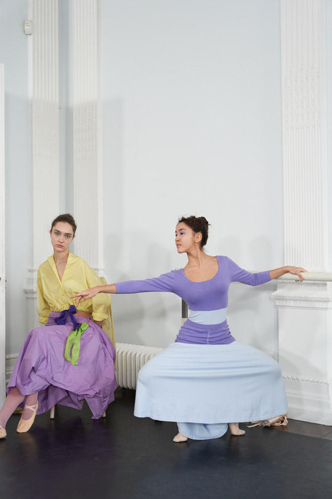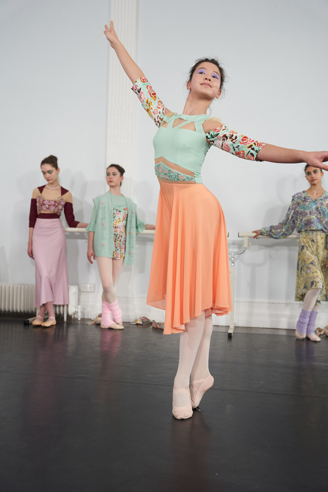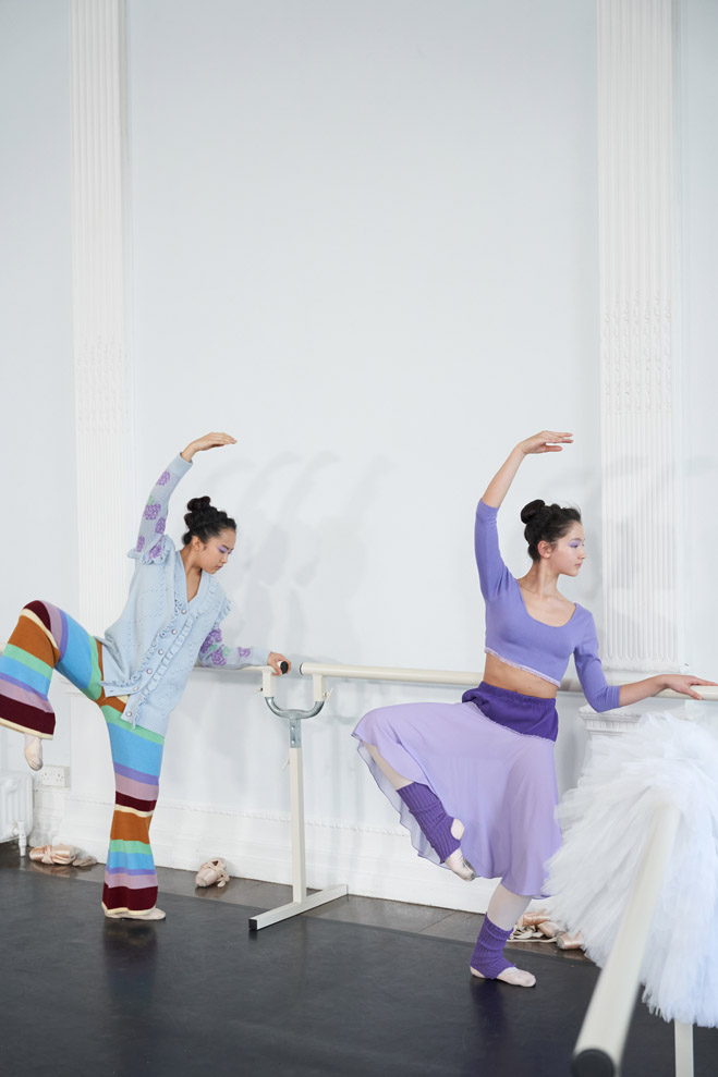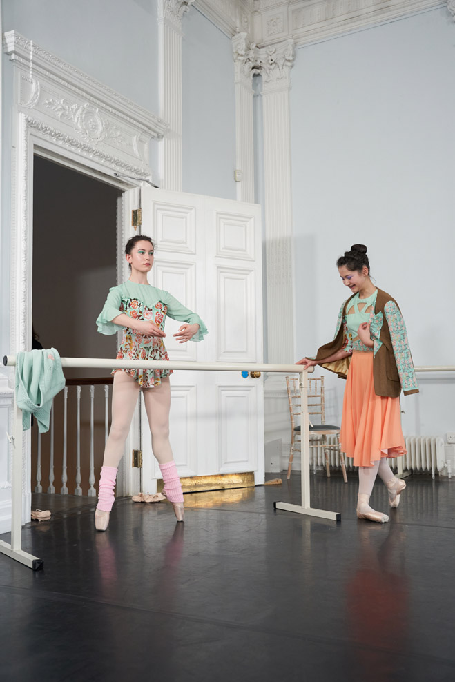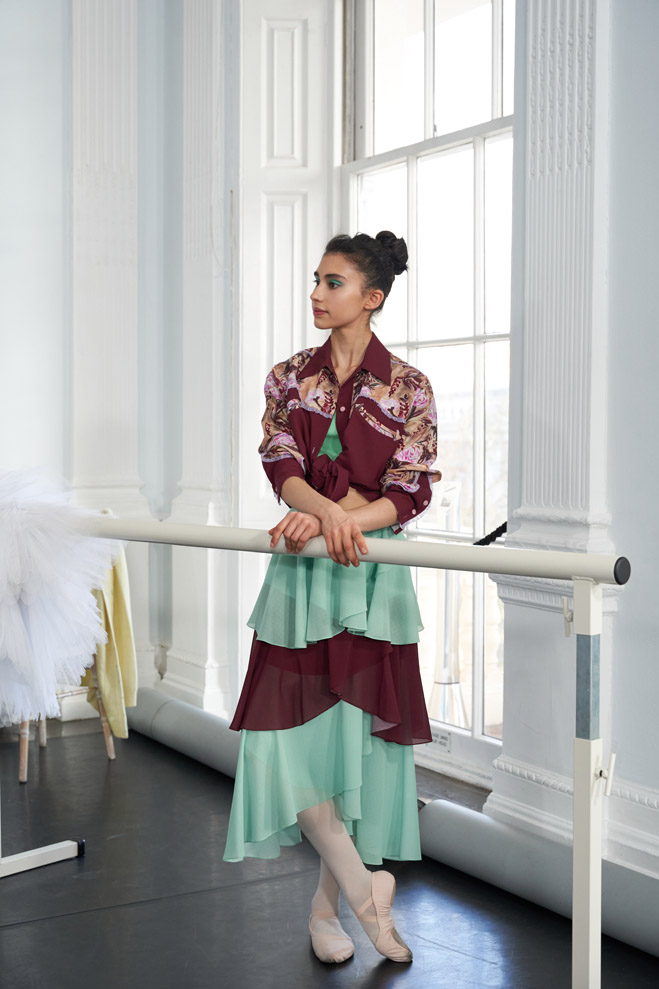 Eschewing the elaborate costumes and flawless performances of the dancers on stage for the behind-the-scenes style at the rehearsals themselves. Tata Naka explores classical studio dance wear – leotards, floaty chiffon skirts, leg warmers, warm up pants – mixed with the dancers off duty looks including cosy knits, tweed blazers and oversized coats.