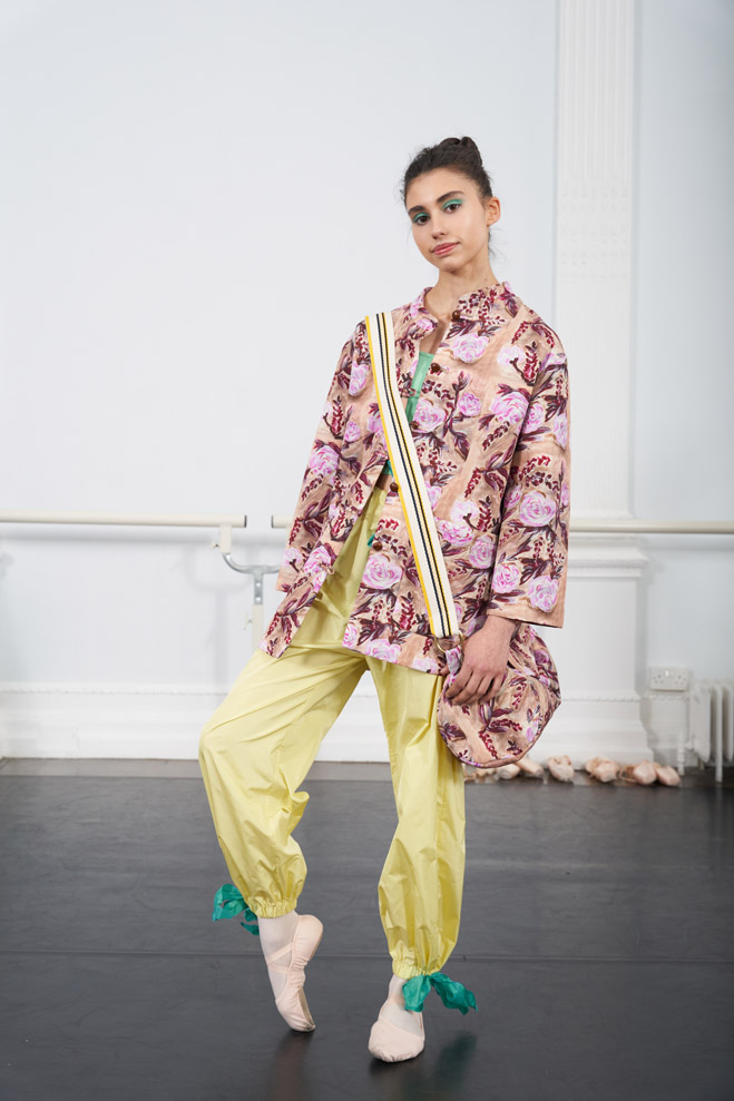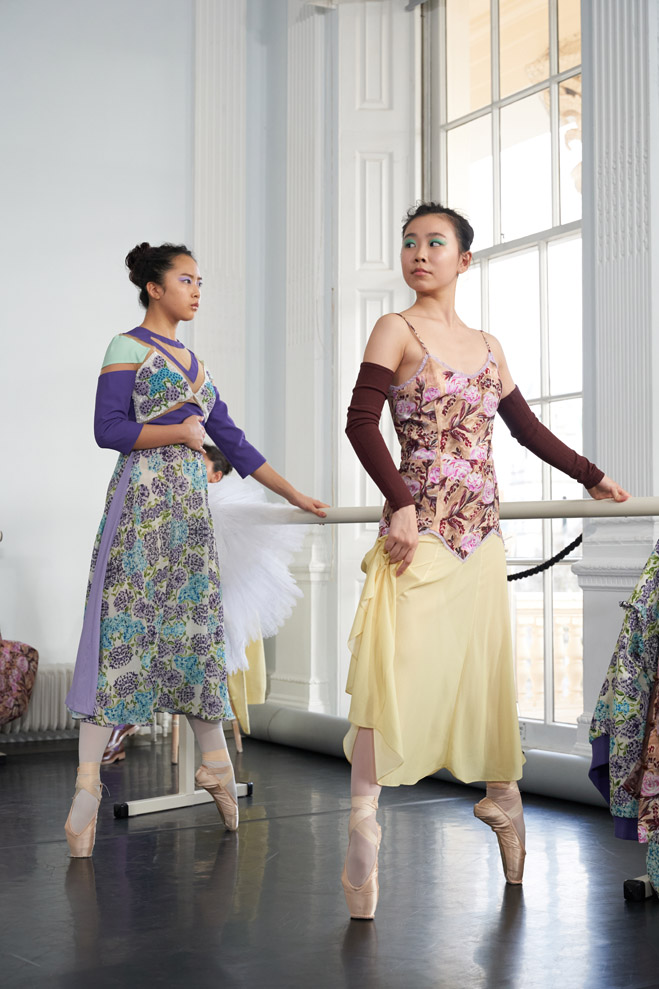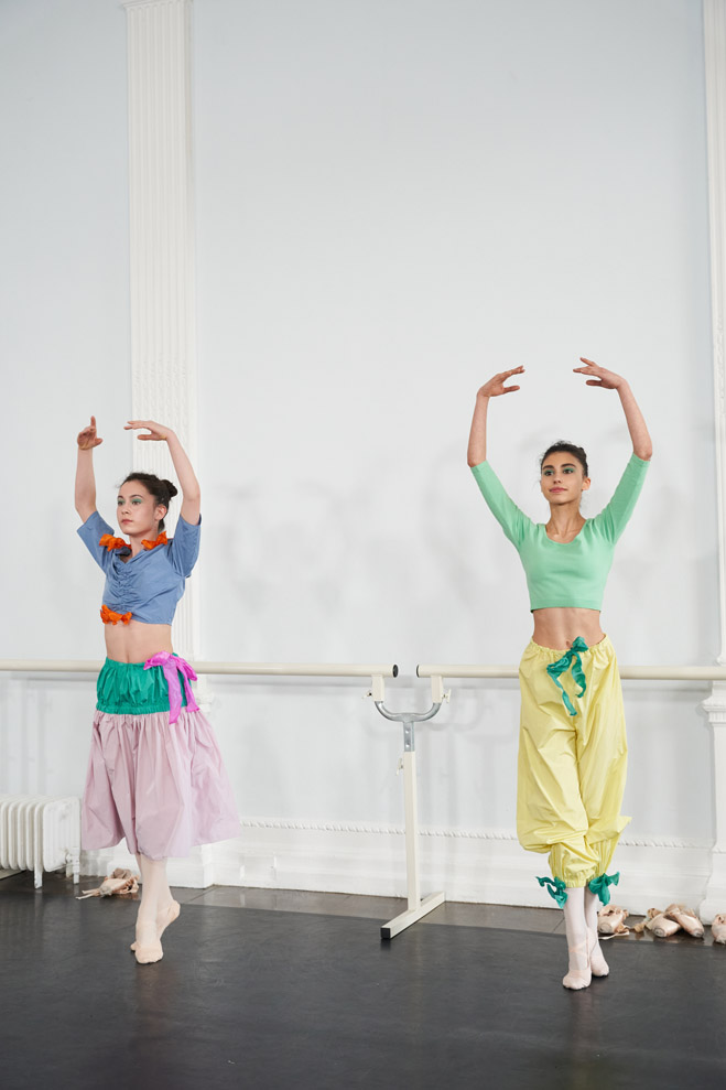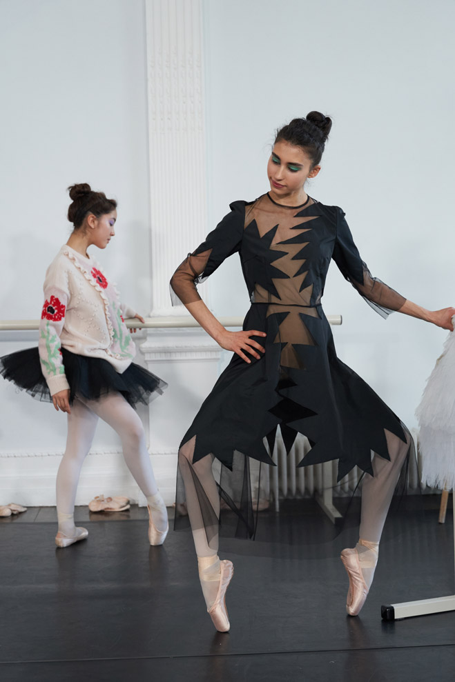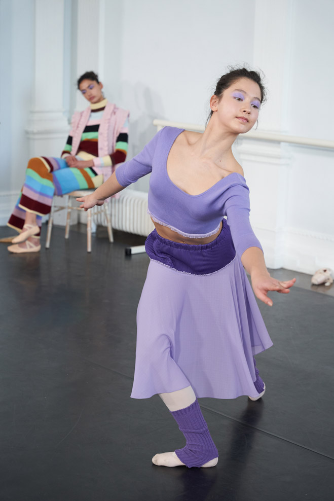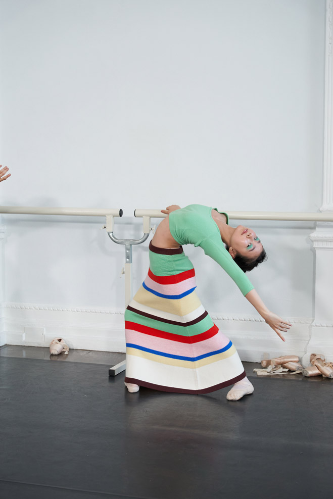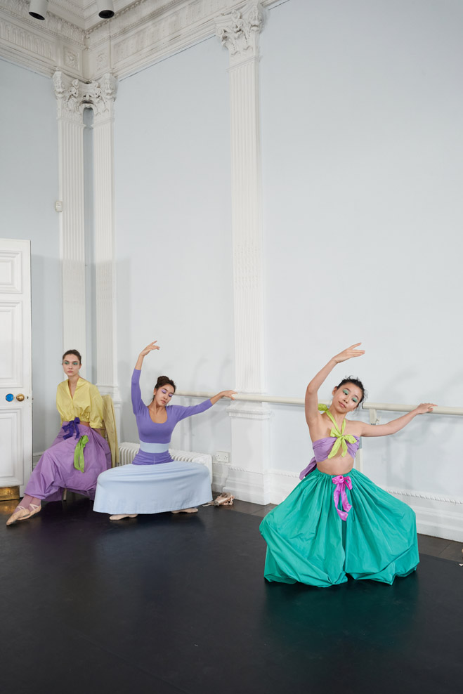 Eschewing the elaborate costumes and flawless performances of the dancers on stage for the behind-the-scenes style at the rehearsals themselves. Tata Naka explores classical studio dance wear – leotards, floaty chiffon skirts, leg warmers, warm up pants – mixed with the dancers off duty looks including cosy knits, tweed blazers and oversized coats.