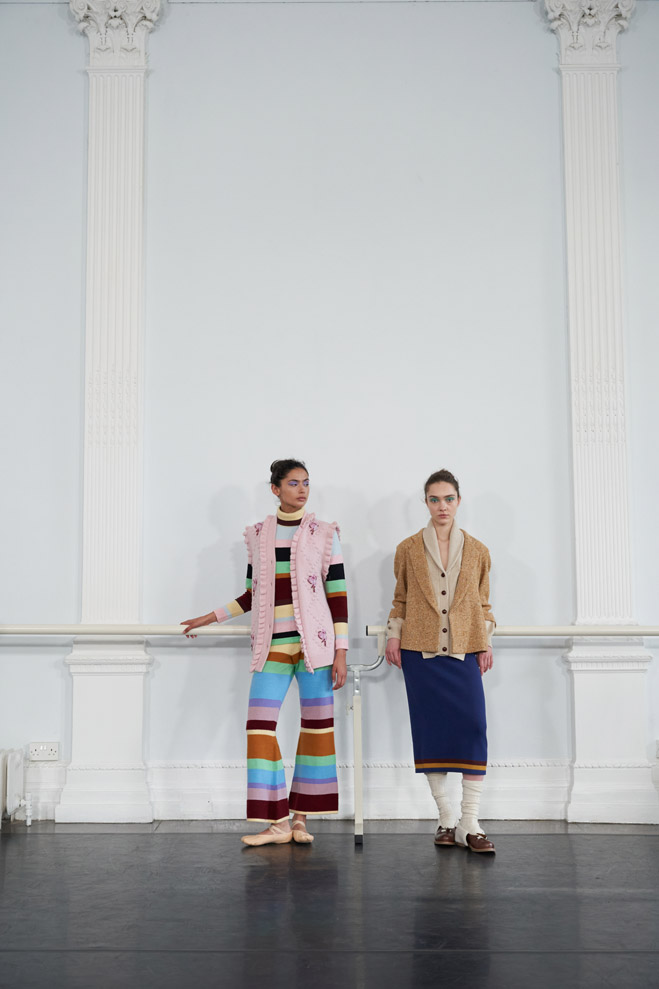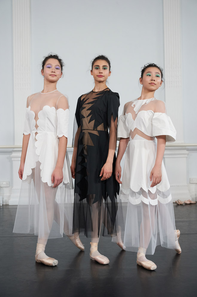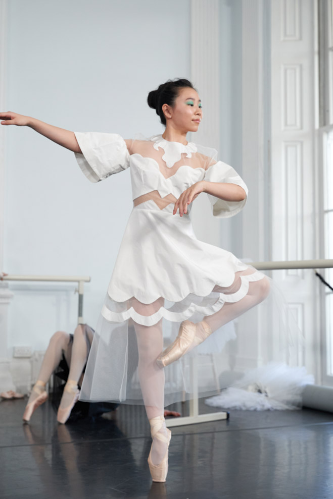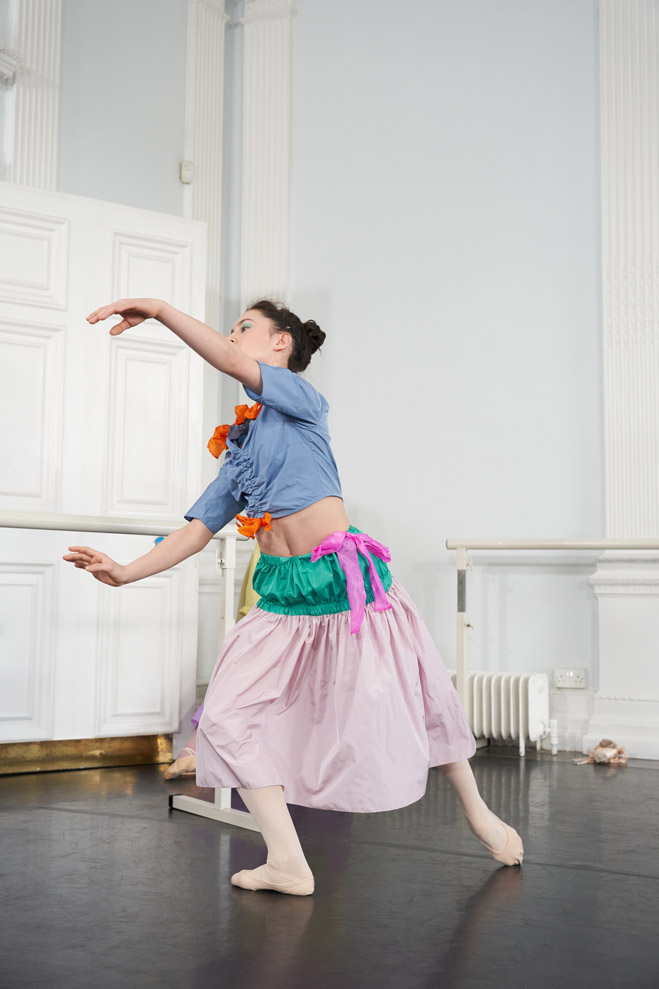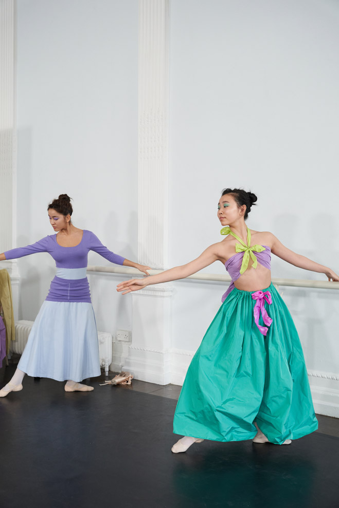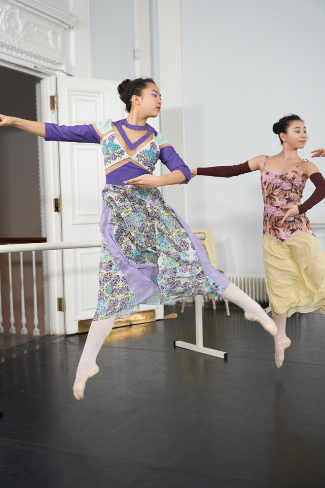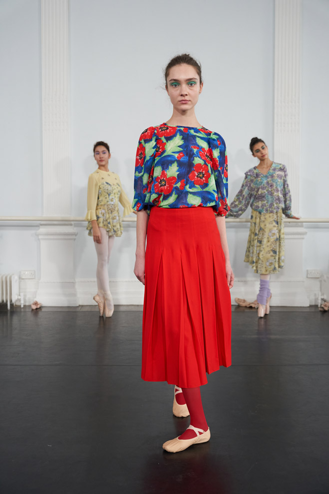 Eschewing the elaborate costumes and flawless performances of the dancers on stage for the behind-the-scenes style at the rehearsals themselves. Tata Naka explores classical studio dance wear – leotards, floaty chiffon skirts, leg warmers, warm up pants – mixed with the dancers off duty looks including cosy knits, tweed blazers and oversized coats.