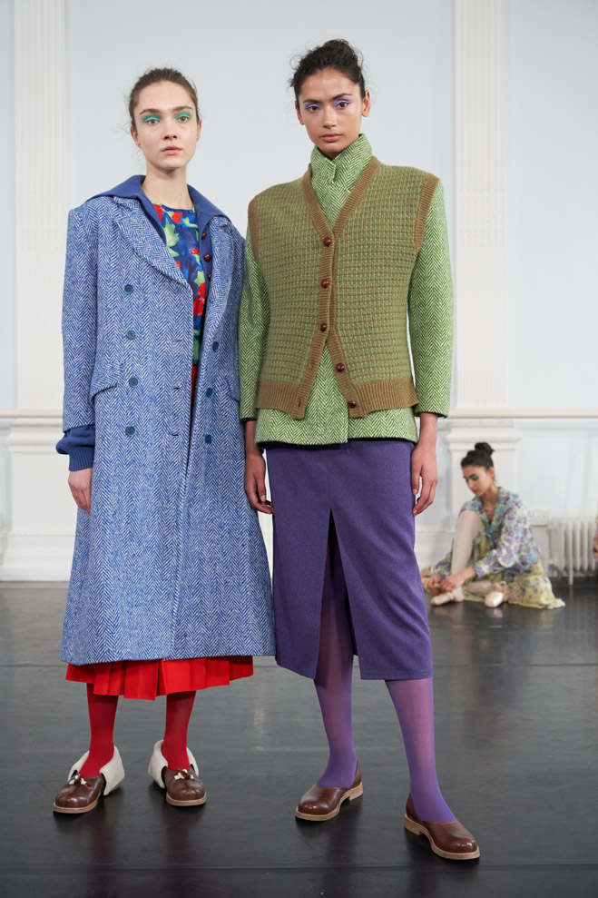 Outerwear includes colourful herringbone tweeds with knitted detailing that creates a layered look, and Tata Naka’s signature padded print bombers and oversized coats.