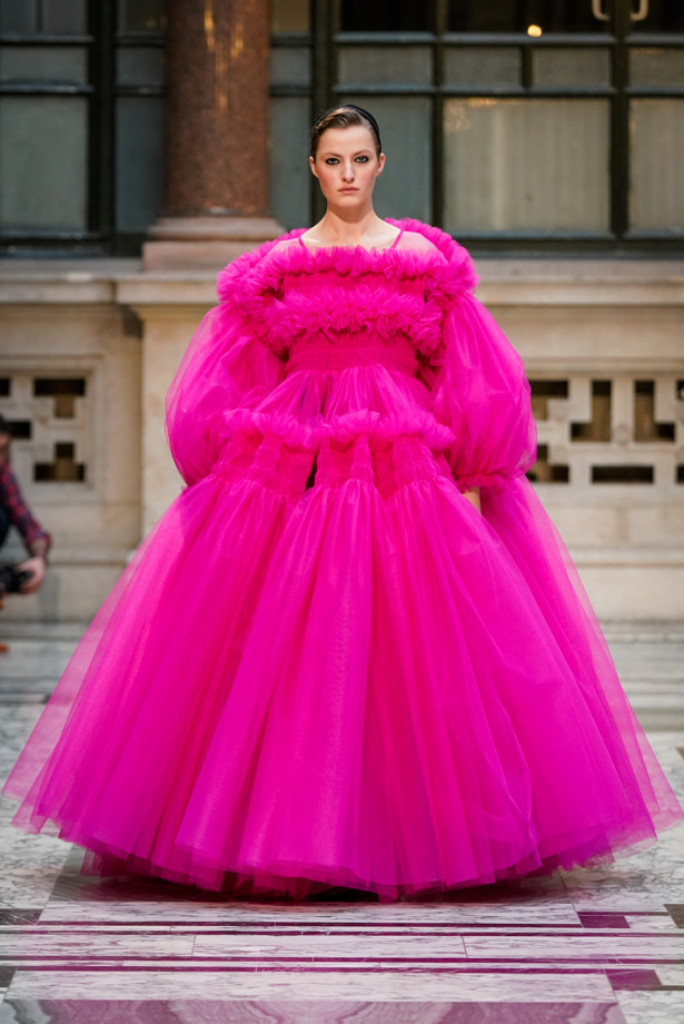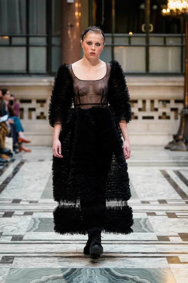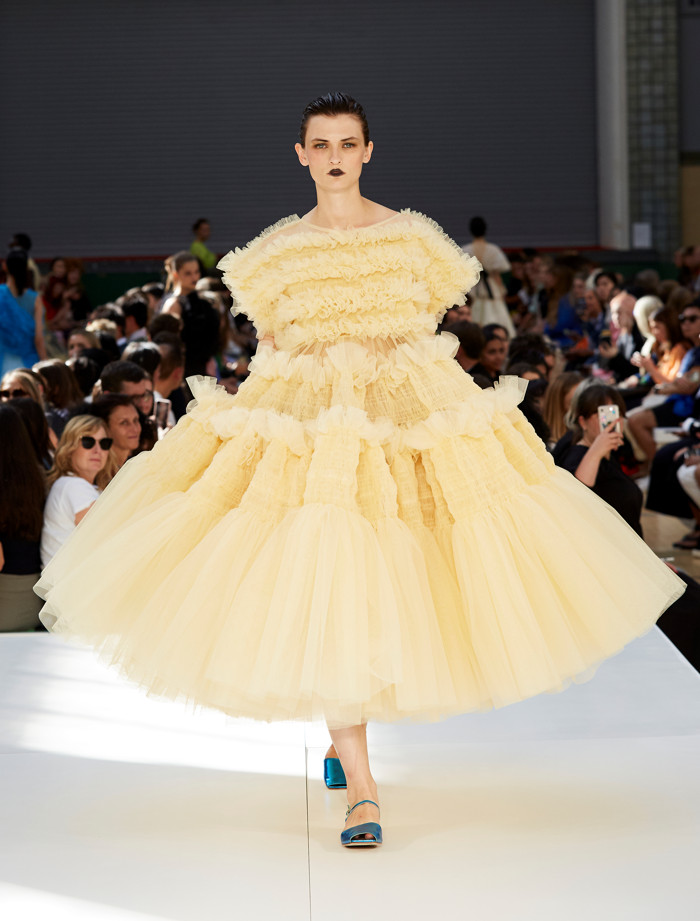 Over the seasons the iconic tulle has been joined by taffeta, organdie and silk in voluminous, tiered and frilled joyful creations. In 2019 Molly took inspiration from the English countryside and also from classic narratives of English literature, in particular from the author Thomas Hardy’s novel, Tess of the d’Urbervilles. Molly explained that these looks were about being frivolous and fabulous but also strong, tough and resilient – not just surviving but thriving. Signature tulle was adapted for all weathers and paired with utilitarian accessories inspired by Thomas Hardy’s ill-fated 19th-century British heroine, Tess Durbeyfield.
