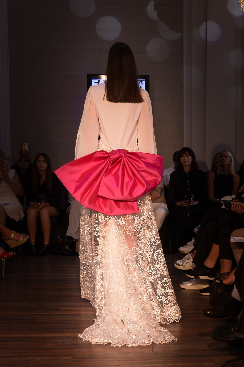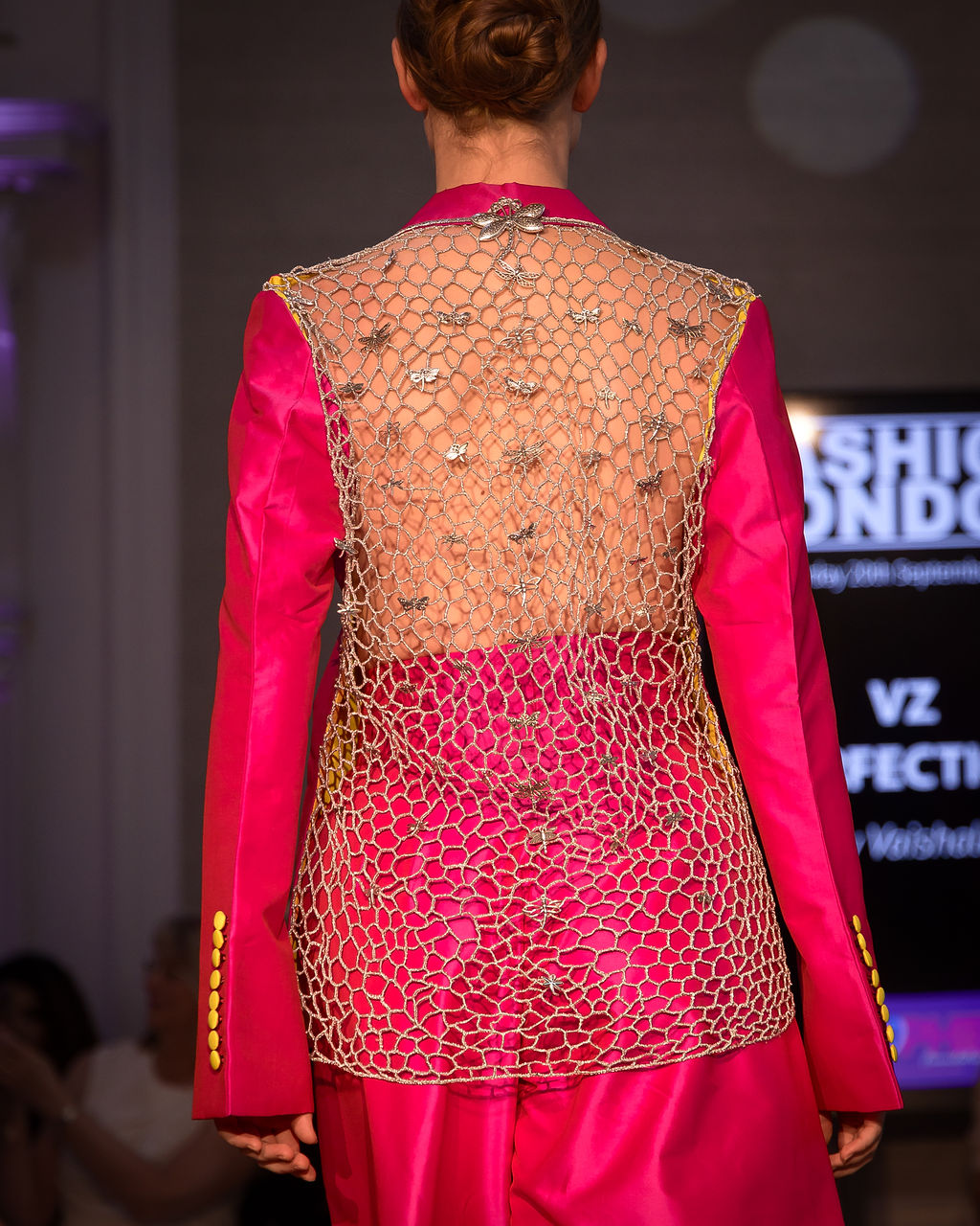 Born from a season of grief, transformation, and resilience, the collection captures the complex emotional landscape of womanhood. Hot pink declares bold femininity, yellow radiates power, and ivory bringing peace and harmony. Hand-embroidered metallic webs map strength and survival highlighting Vaishali’s vision in seamlessly blending British Tailoring with Indian Artisanal work. While symbolic details — doves for peace, dragonflies for transformation, and semi-precious stones like amethyst and rose quartz — turn couture into talismans of healing and courage. The fabrics, too, speak in contradictions: fluid, floaty satin next to sharply structured silk.