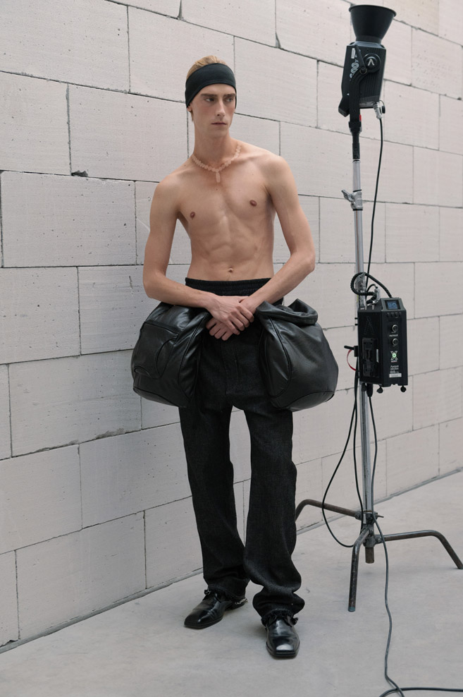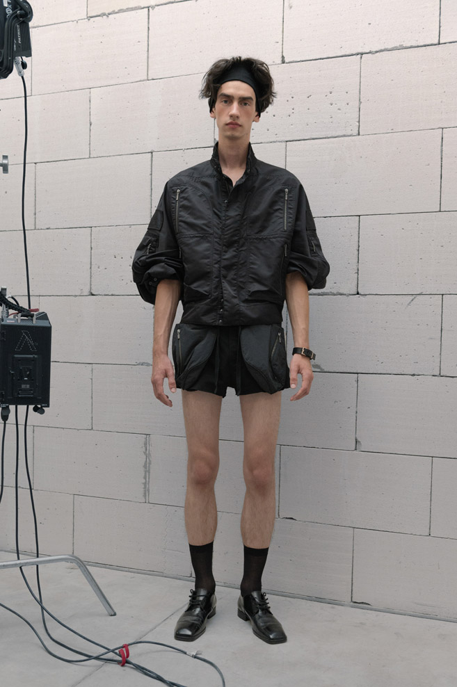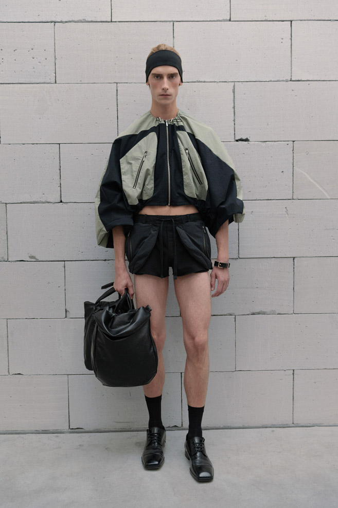 The starting point of the new collection is the iconic double-breasted THEO jacket, reimagined with voluminous sleeves adorned with unique relief patterns as well as denim pleats, complemented by capacious portfolio pockets at the front. At the center of attention is the new version of the signature TMBY jacket, reminiscent of an oversized lightweight sports blouson with raglan sleeves, crafted from matte Japanese taffeta that mimics the feel of cotton. This jacket is embellished with contrasting fabric details and patch pockets with metallic zippers. Another version of the jacket is the Ultra-Oversized TMBY in distressed, weathered blue and white denim. Long nylon Multi-Pocket loose-fitting parkas, and cotton and denim , each with an asymmetrical, drawn-in hem and detachable, wide hood.