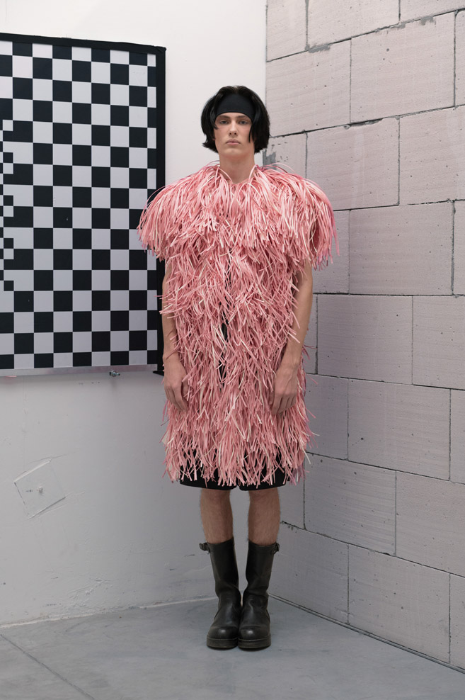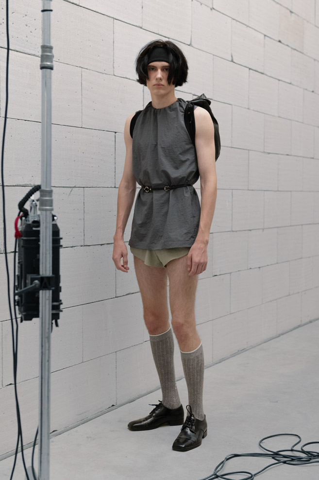 A muted neutral, timeless color palette of “The Collection” is paired with a variety of textures and bold detailing – deconstructed jackets with prominent oversized pockets and visible metallic hardware, ultra-short dresses with slender Japan seersucker nylon bodices and thin straps, and “ugly” straight-cut jeans with a deliberately low seat line made of Japanese twill and distressed denim.