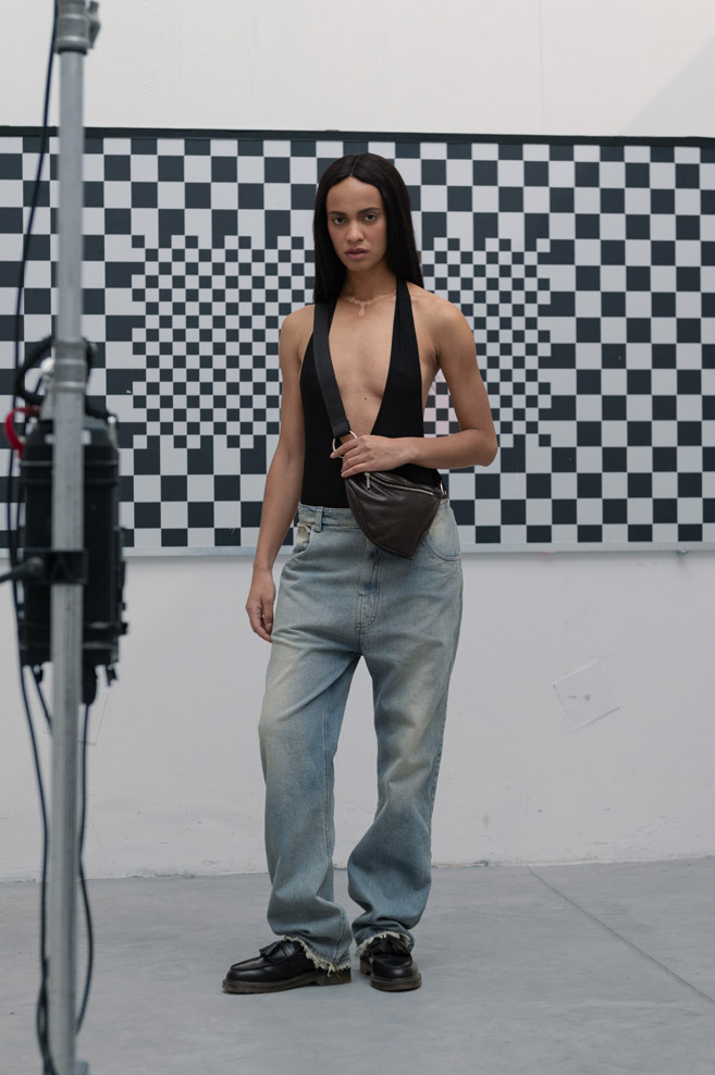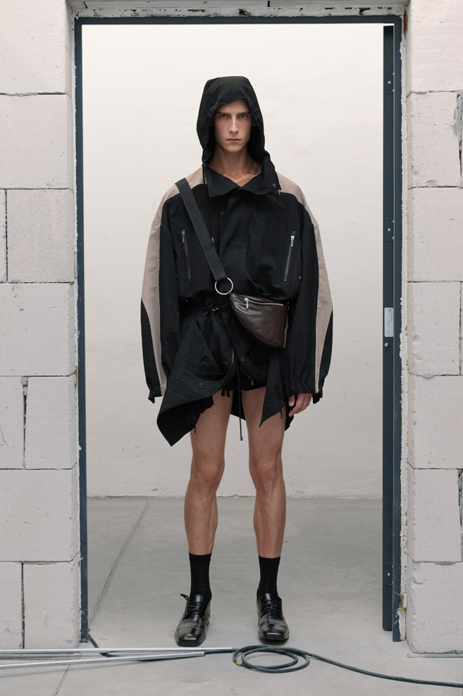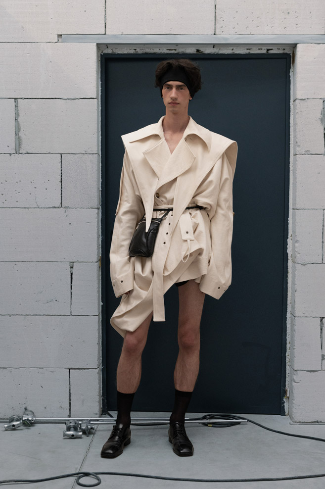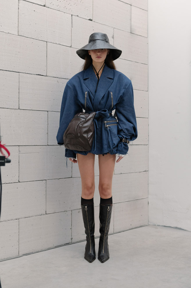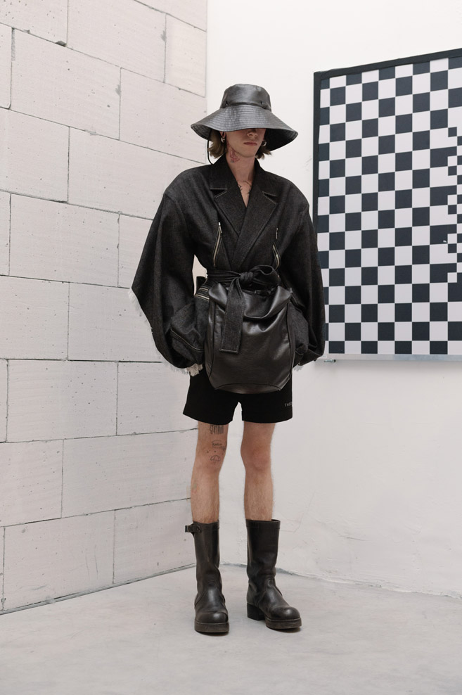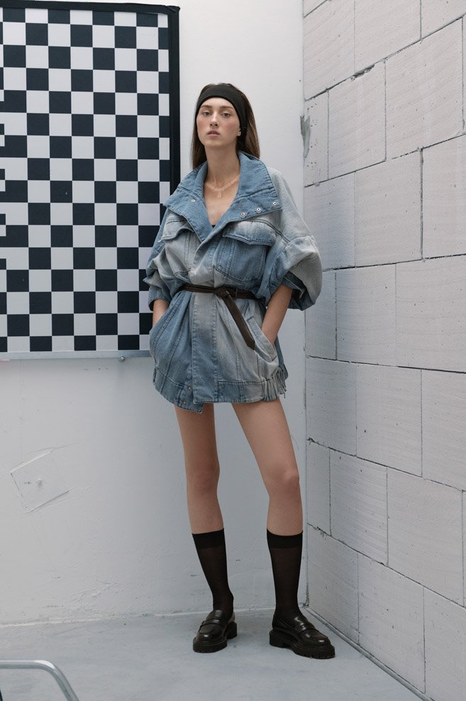 The starting point of the new collection is the iconic double-breasted THEO jacket, reimagined with voluminous sleeves adorned with unique relief patterns as well as denim pleats, complemented by capacious portfolio pockets at the front. At the center of attention is the new version of the signature TMBY jacket, reminiscent of an oversized lightweight sports blouson with raglan sleeves, crafted from matte Japanese taffeta that mimics the feel of cotton. This jacket is embellished with contrasting fabric details and patch pockets with metallic zippers. Another version of the jacket is the Ultra-Oversized TMBY in distressed, weathered blue and white denim. Long nylon Multi-Pocket loose-fitting parkas, and cotton and denim , each with an asymmetrical, drawn-in hem and detachable, wide hood.