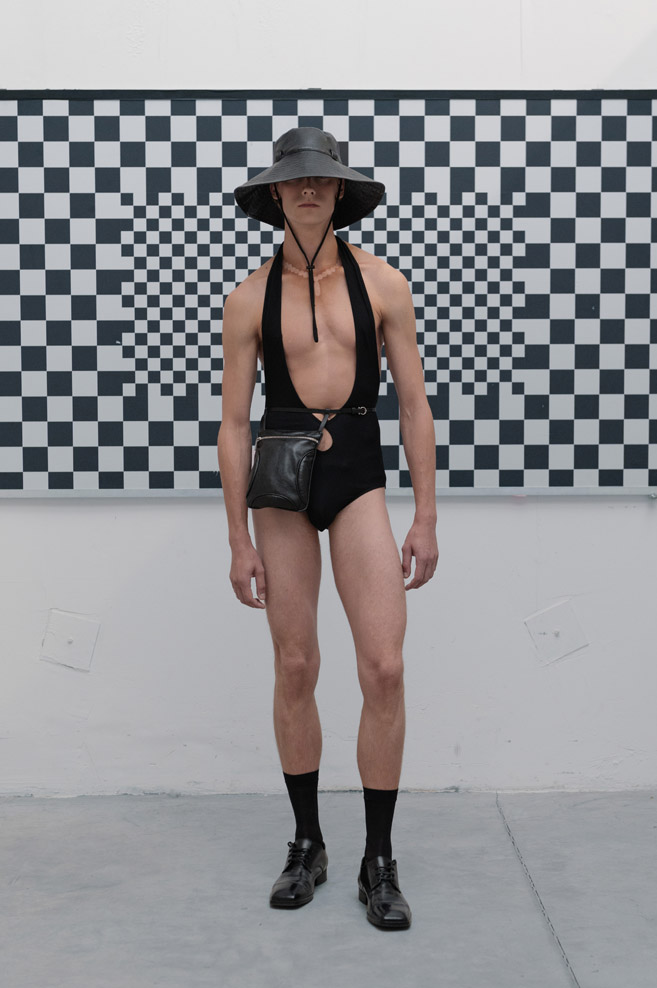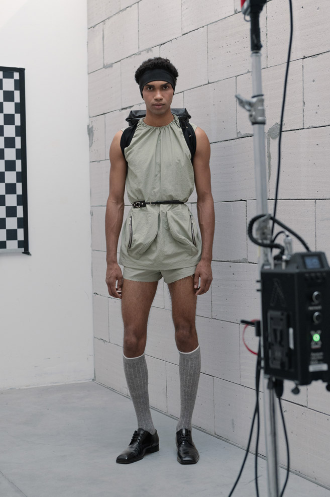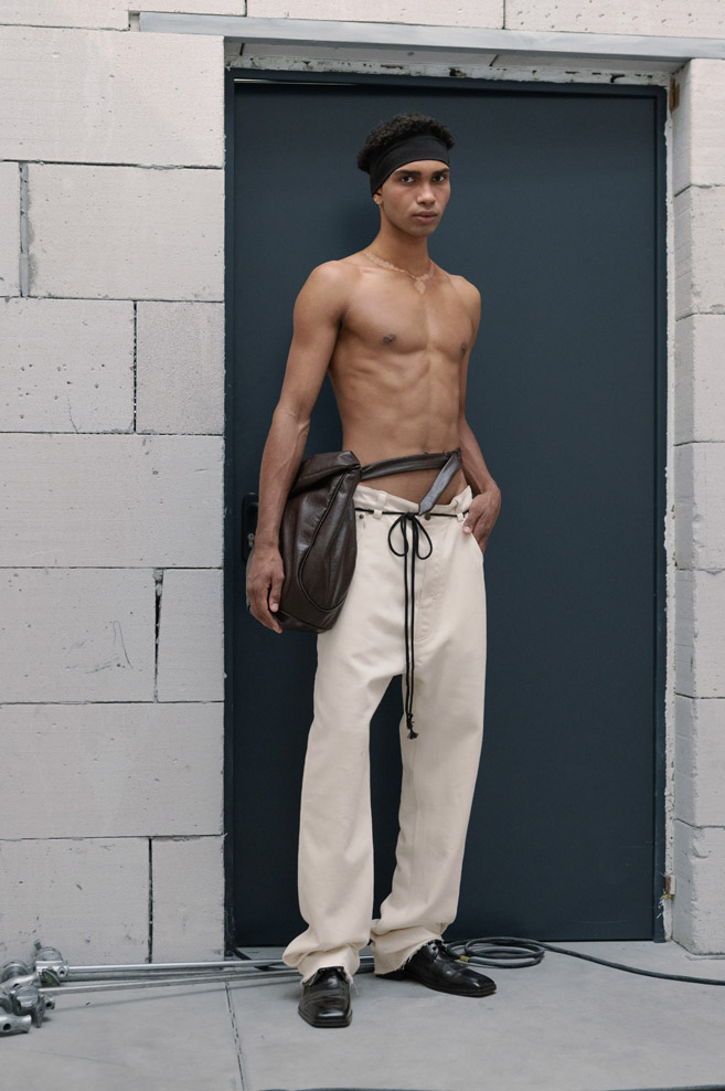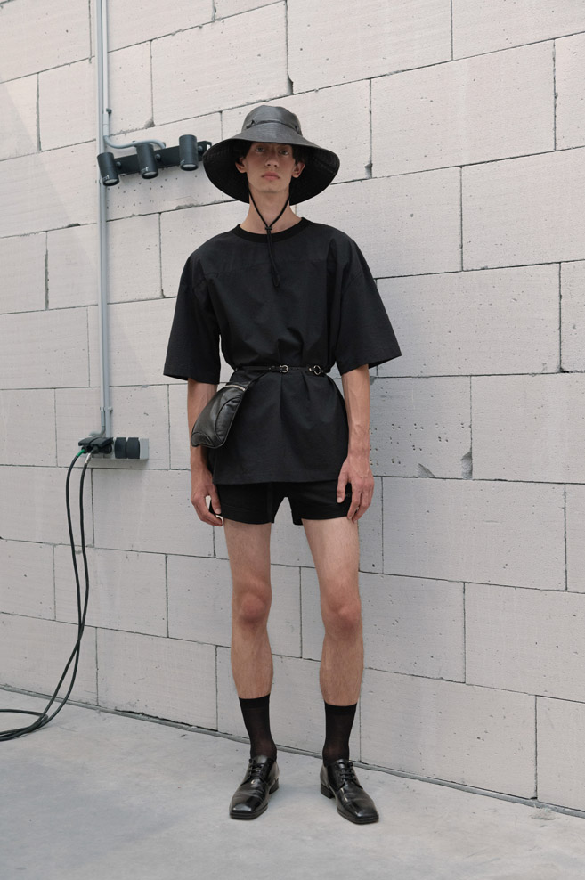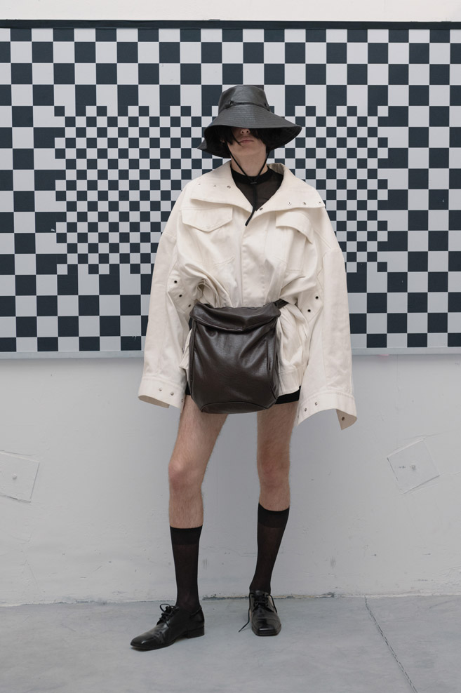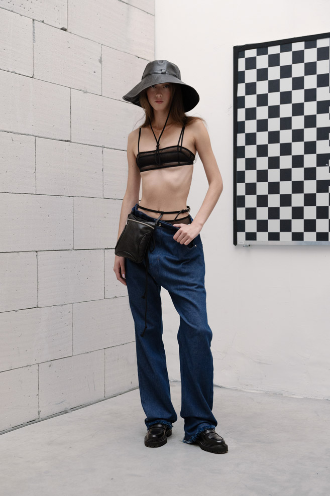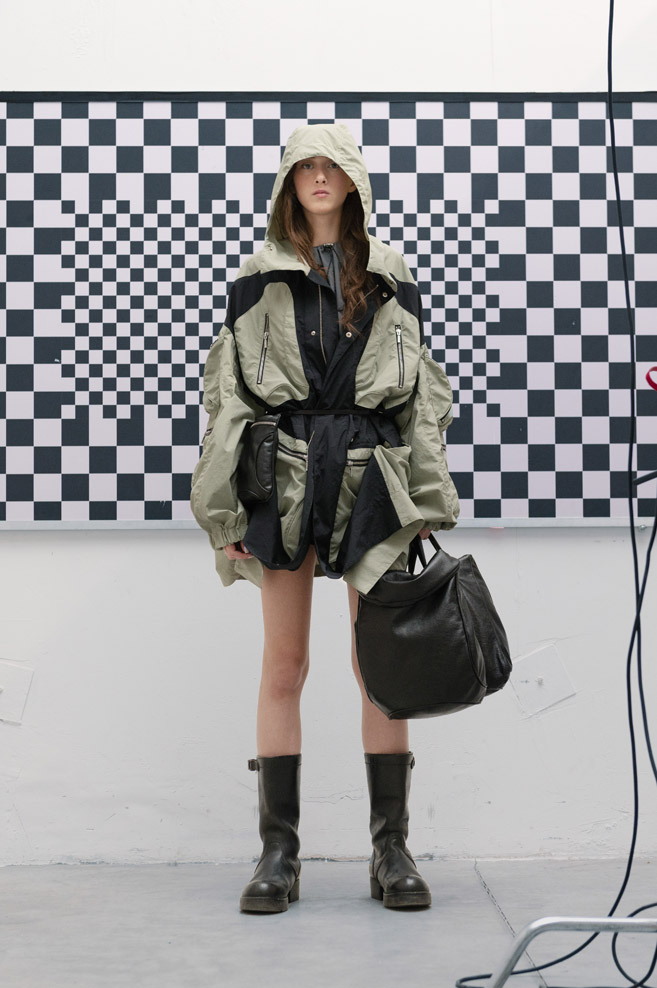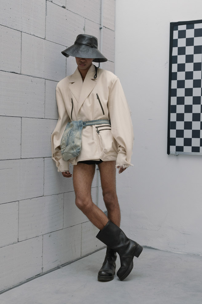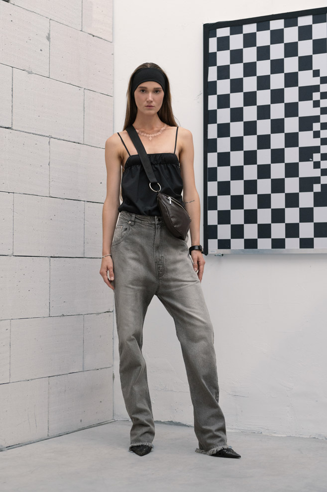 A muted neutral, timeless color palette of “The Collection” is paired with a variety of textures and bold detailing – deconstructed jackets with prominent oversized pockets and visible metallic hardware, ultra-short dresses with slender Japan seersucker nylon bodices and thin straps, and “ugly” straight-cut jeans with a deliberately low seat line made of Japanese twill and distressed denim.