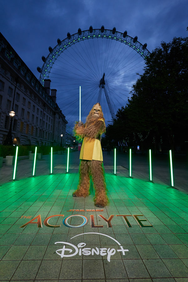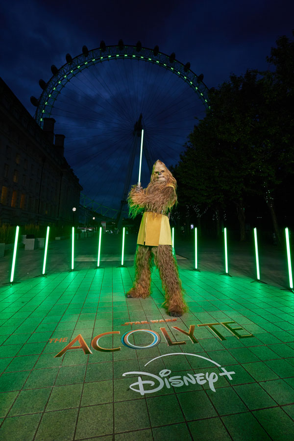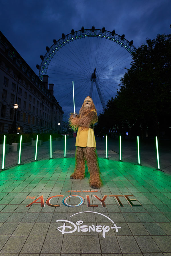 [London, May 29, 2024]: To honour the release of Star Wars: The Acolyte, the London Eye lit up to welcome our live-action Jedi Wookiee, Kelnacca to London. Joining Kelnacca at the London Eye was a host of fans in Jedi costumes holding their lightsabers aloft. The iconic London landmark shone bright green to reflect Kelnacca’s lightsaber. Star Wars: The Acolyte will be exclusively streaming on Disney+ from June 5th.
