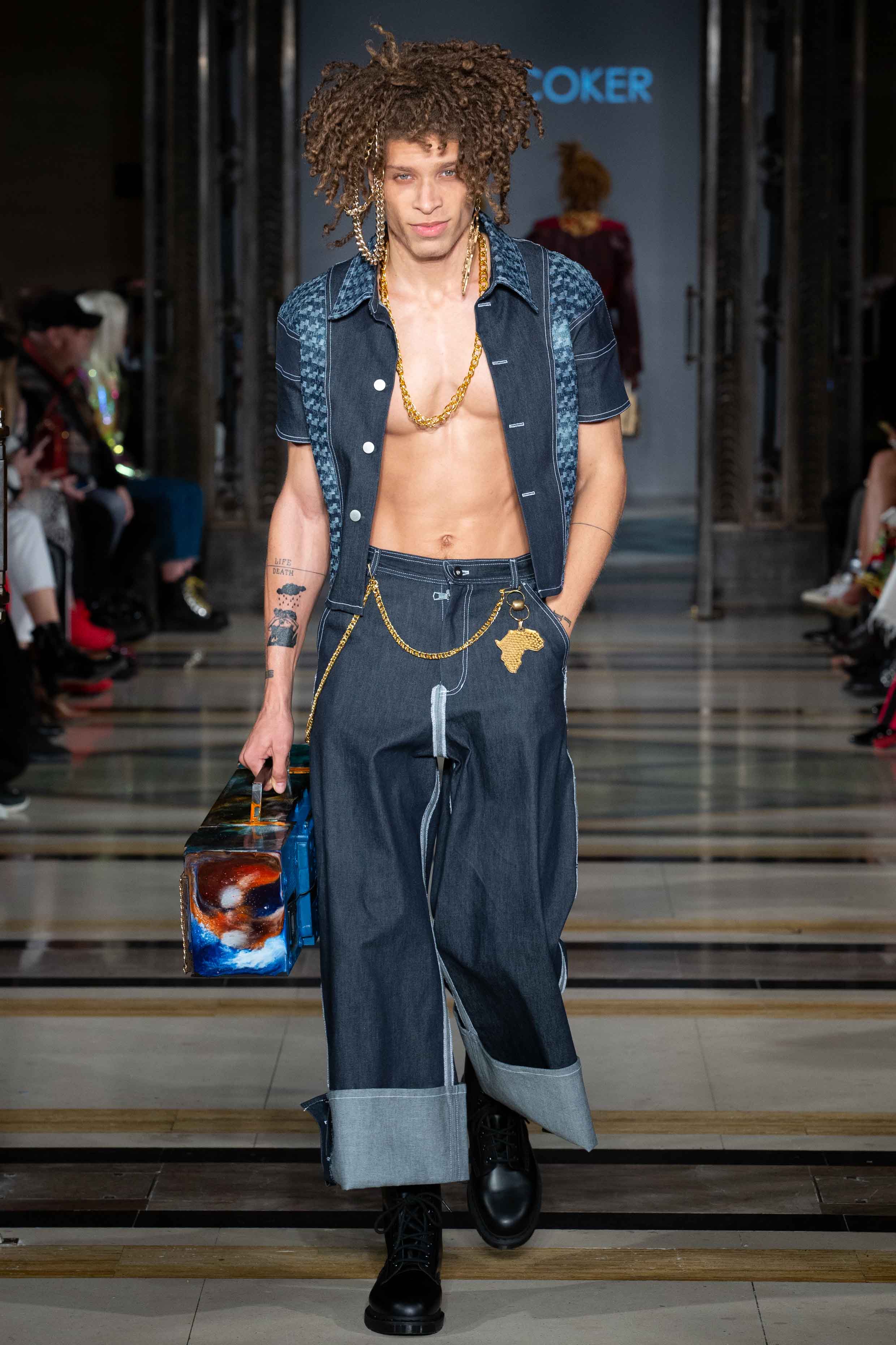 Reworked denims, recycled leathers and re-used plastic and lace scraps are paired alongside striking and daring silhouettes, bold illustrative prints/embroideries and a playground of textures to add a youthful, contemporary and luxurious flair to each piece. Black and white feature heavily within the new collection, gives a youthful freshness, with many outfits containing being classic casual silhouettes of hoodies and jeans but also with Nigerian tribal head pieces. The brand is a catalyst for acceptance and freedom in fashion as well as a tool to urge consumers to move towards buying more investment clothing pieces – clothing that is timeless and in its longevity, reducing carbon footprint.