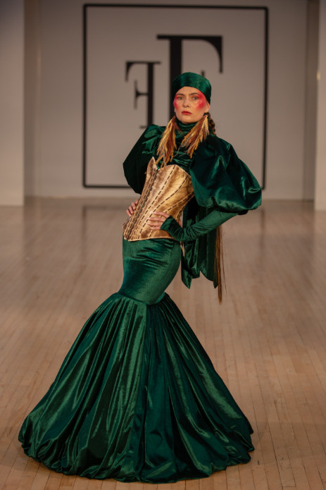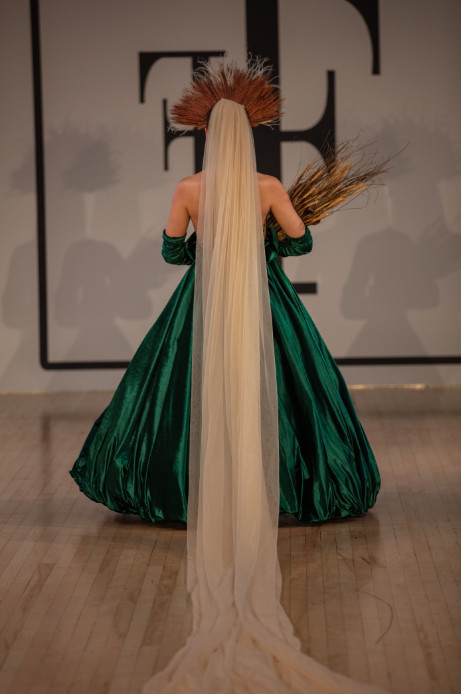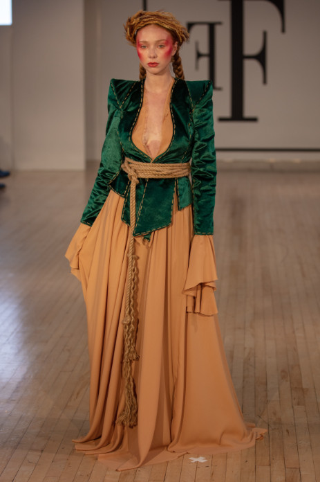 TuncerTonun quoted that ‘while making these designs, the Amazon forests started to burn. The destruction of nature in the Kaz Mountains and the fires in Izmir also affected me. In this collection, I equated women and nature. I believe that both have the power to create and the power to destroy. I used mostly poison green and earth tones. The power of nature dominates with poison green and the earth and the colour green are integrated as one. Nature shows a great awakening to mother earth. If you don’t show enough love to woman and nature, she may suffocate you with hatred. If we don’t take our hands off of nature, it will take its revenge humankind one day. ’