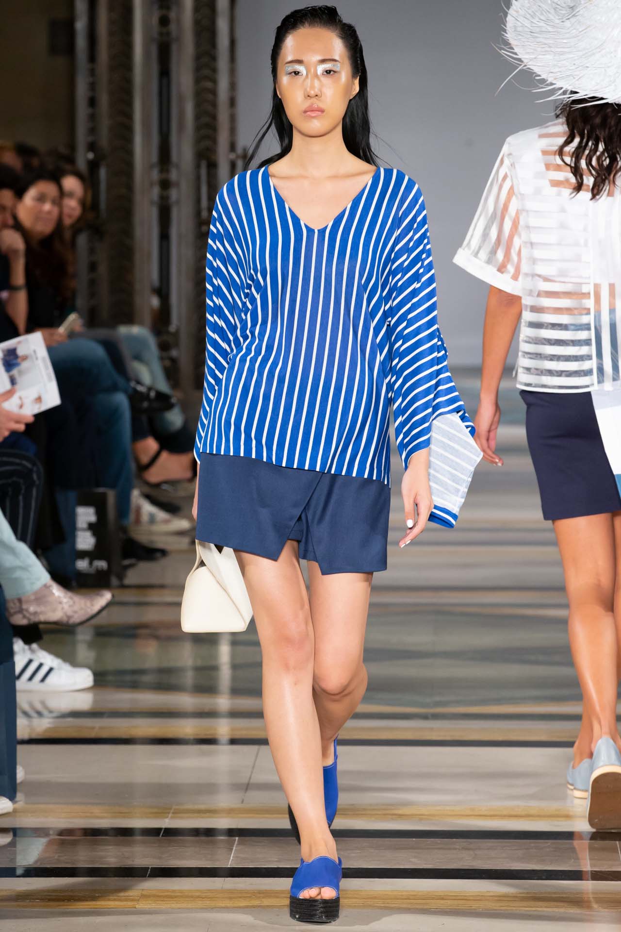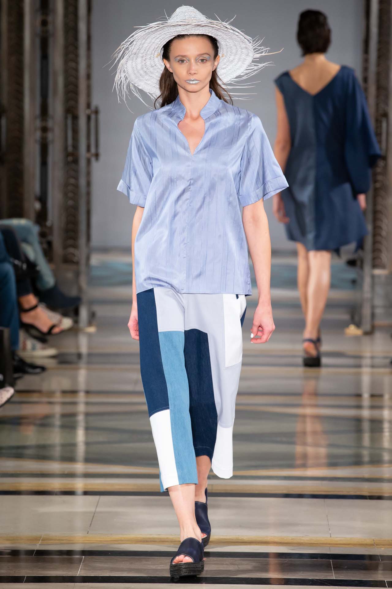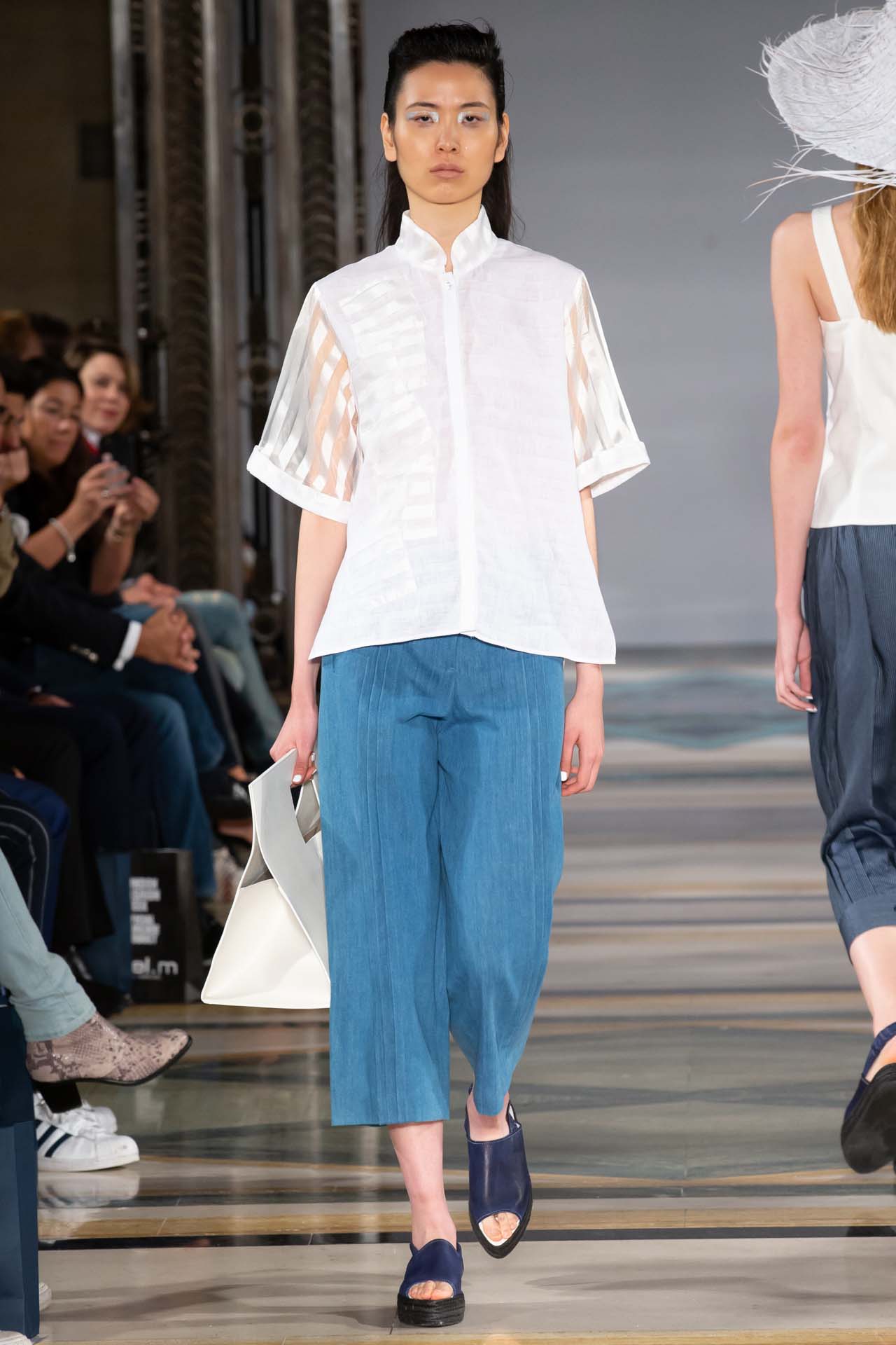 For 5519, Outre-mer collection ANISSA AIDA is in line with the previous collections, through the use of stripes and a colour palette composed of shades of blue and white inspired by Mediterranean villages. It is also bringing some newness with the introduction of patchworks. “Japanese Boro textiles and their patchwork aesthetic, as well as waste reducing tradition inspired this collection. A combination of Tunisian and Japanese cultures influenced the young Tunisian-born designer”. (WWD, February 2018).