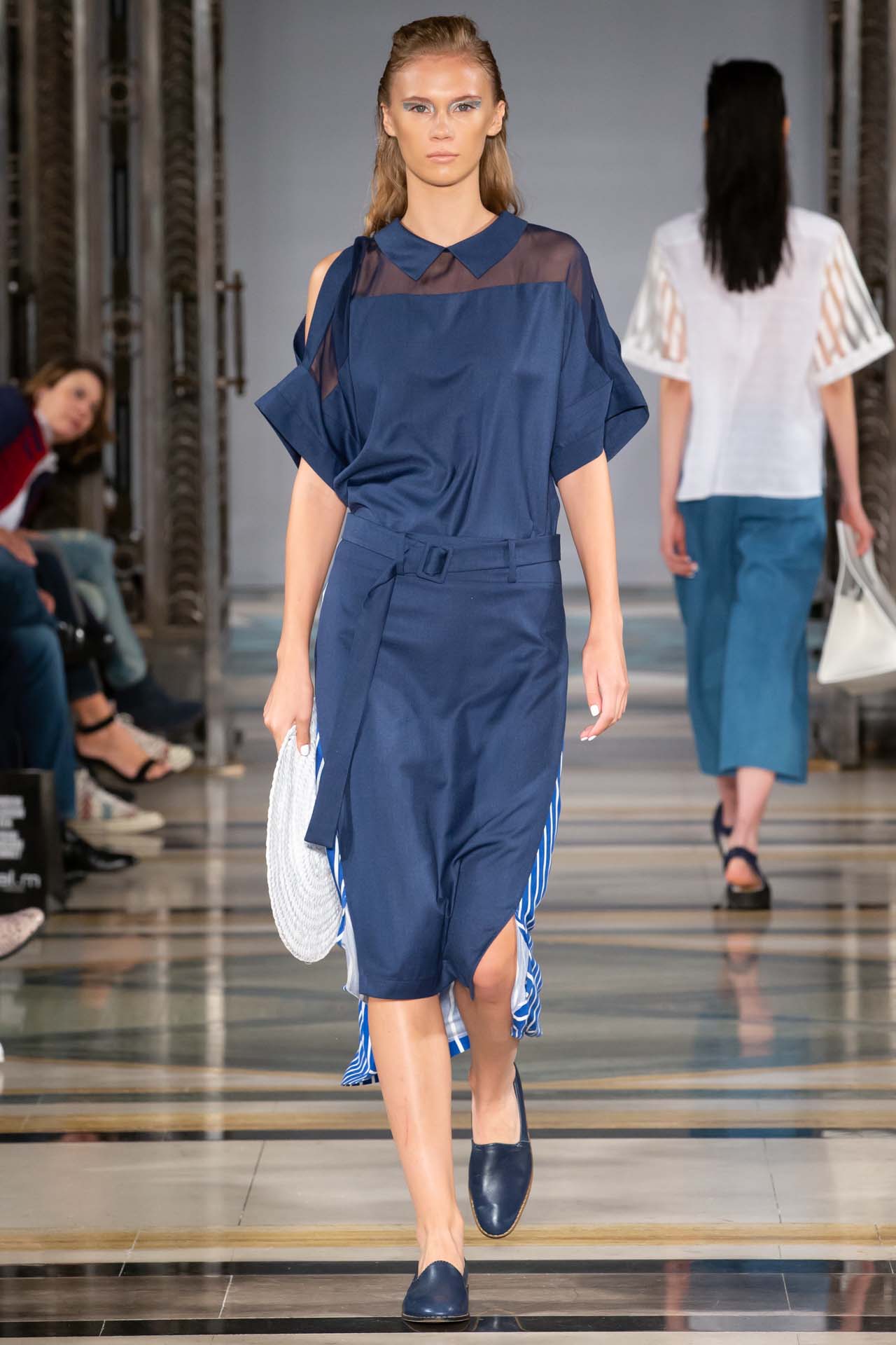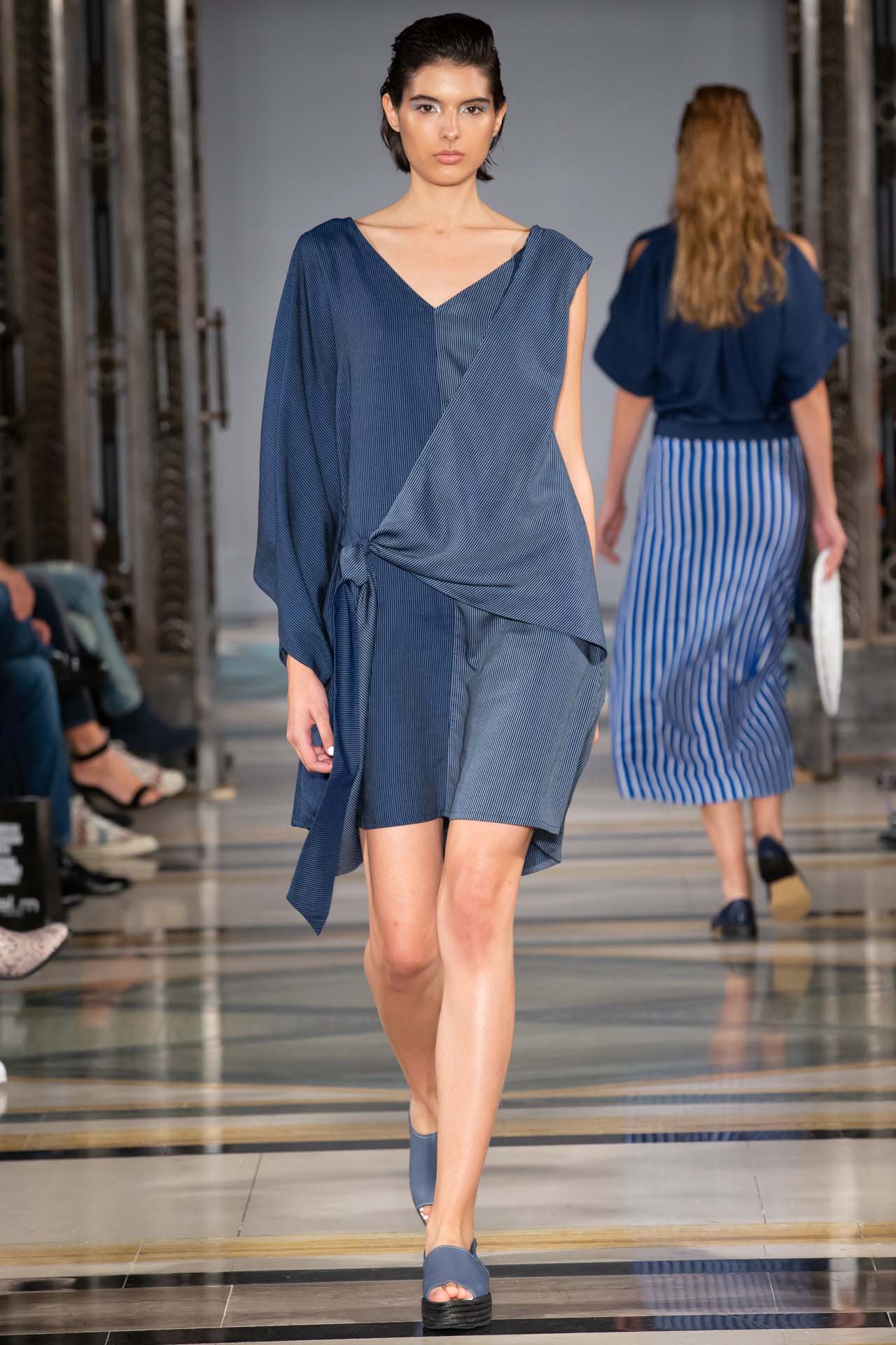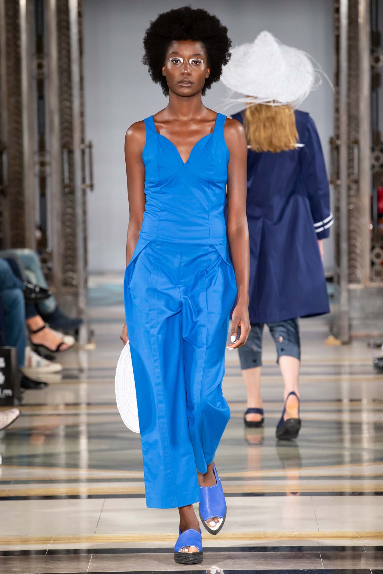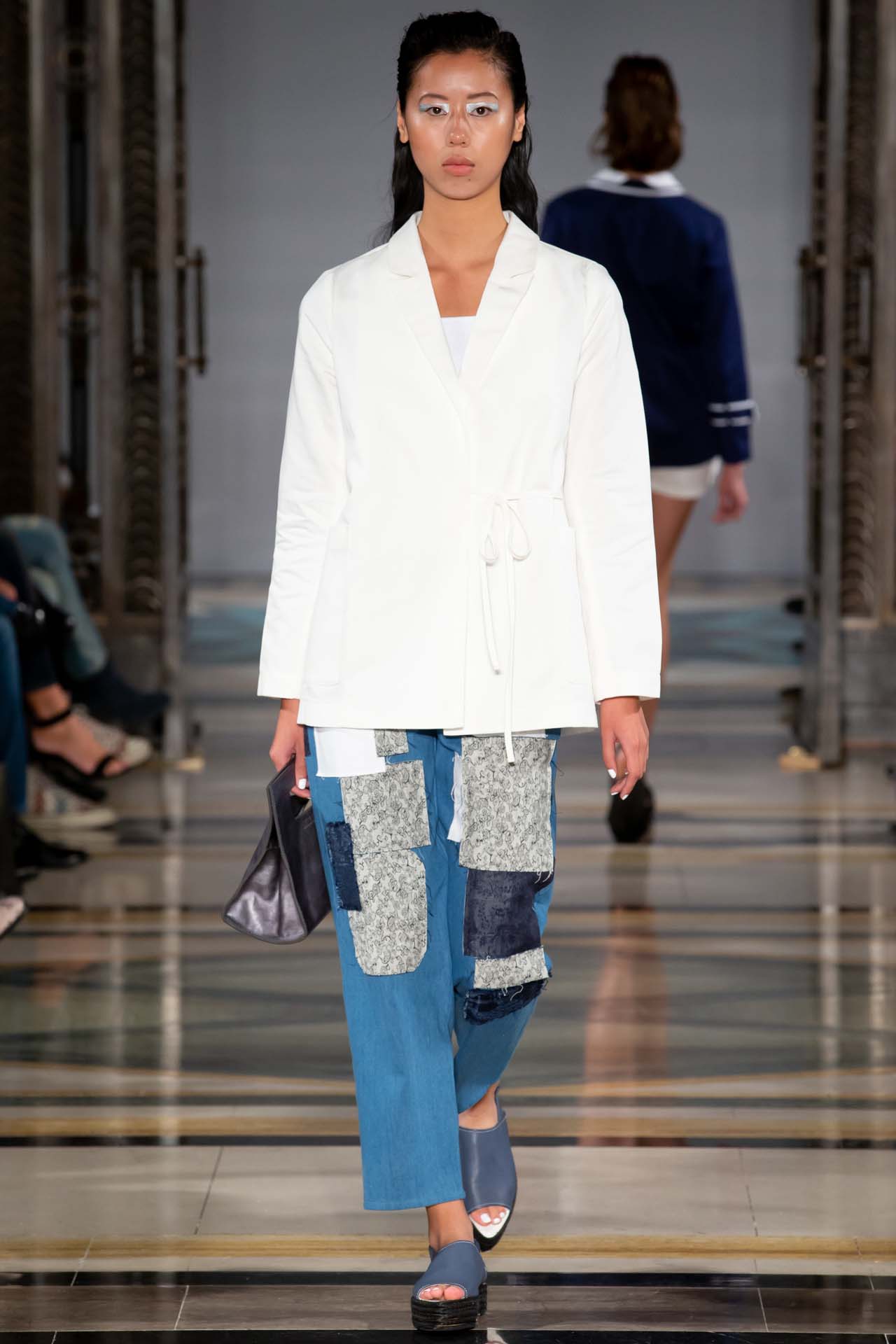 For 5519, Outre-mer collection ANISSA AIDA is in line with the previous collections, through the use of stripes and a colour palette composed of shades of blue and white inspired by Mediterranean villages. It is also bringing some newness with the introduction of patchworks. “Japanese Boro textiles and their patchwork aesthetic, as well as waste reducing tradition inspired this collection. A combination of Tunisian and Japanese cultures influenced the young Tunisian-born designer”. (WWD, February 2018).
