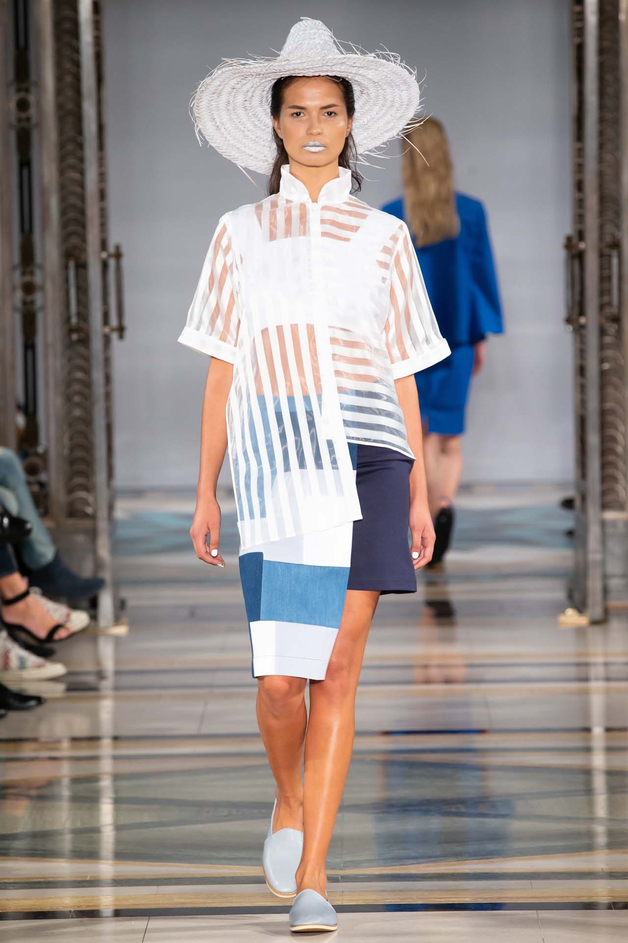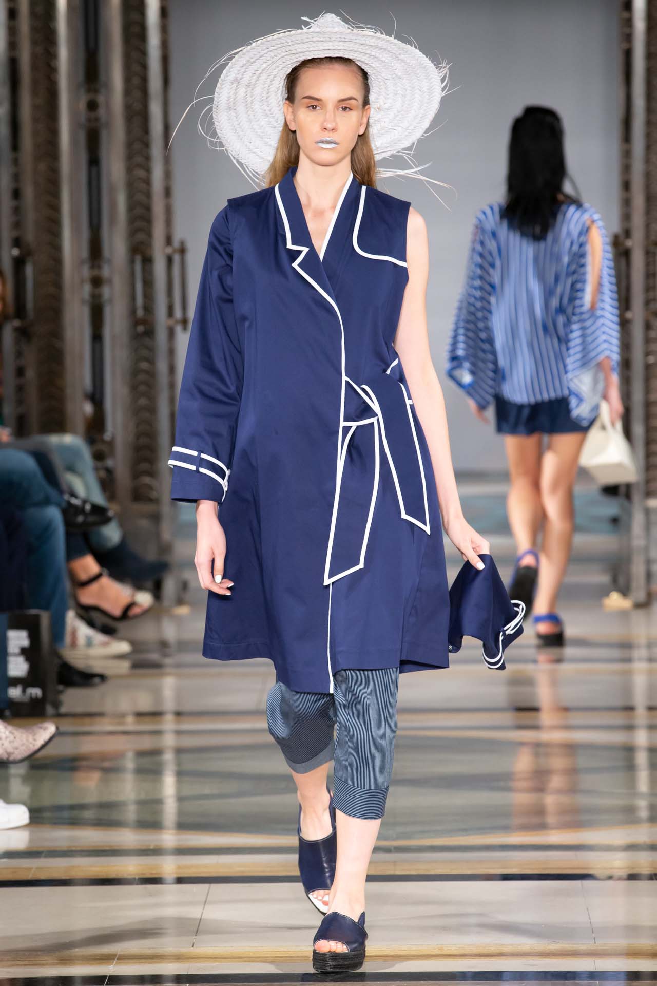 For 5519, Outre-mer collection ANISSA AIDA is in line with the previous collections, through the use of stripes and a colour palette composed of shades of blue and white inspired by Mediterranean villages. It is also bringing some newness with the introduction of patchworks. “Japanese Boro textiles and their patchwork aesthetic, as well as waste reducing tradition inspired this collection. A combination of Tunisian and Japanese cultures influenced the young Tunisian-born designer”. (WWD, February 2018).