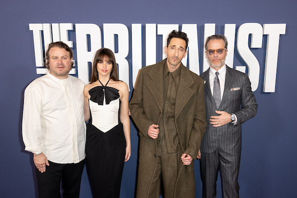(L to R) Brady Corbet, Felicity Jones, Adrien Brody and Guy Pearce attend the UK Special Screening of Universal Pictures ‘The Brutalist’ at Picturehouse Central on January 15th, 2025 in London, England. (Photo by Craig Gibson/StillMoving.Net for Universal Pictures)