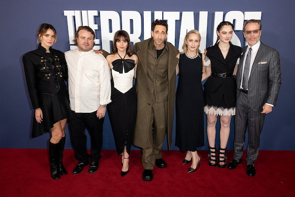 (L to R) Stacy Martin, Brady Corbet, Felicity Jones, Adrien Brody, Mona Fastvold, Raffey Cassidy and Guy Pearce attend the UK Special Screening of Universal Pictures ‘The Brutalist’ at Picturehouse Central on January 15th, 2025 in London, England. (Photo by Craig Gibson/StillMoving.Net for Universal Pictures)