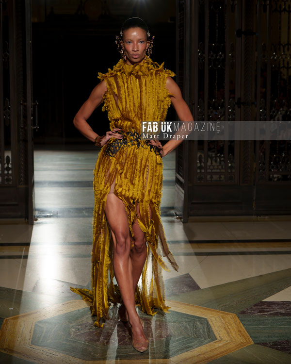 Elsewhere, a gold sculptural two-piece recalled sun-worship armour, its spiked contours catching the light with an almost celestial energy. A cascade of translucent fringe on another dress moved like liquid moonlight, while body-hugging lattice pieces clung to models with the tension of something between vine and architecture. Each look was a dialogue between fragility and strength, between the organic and the otherworldly.