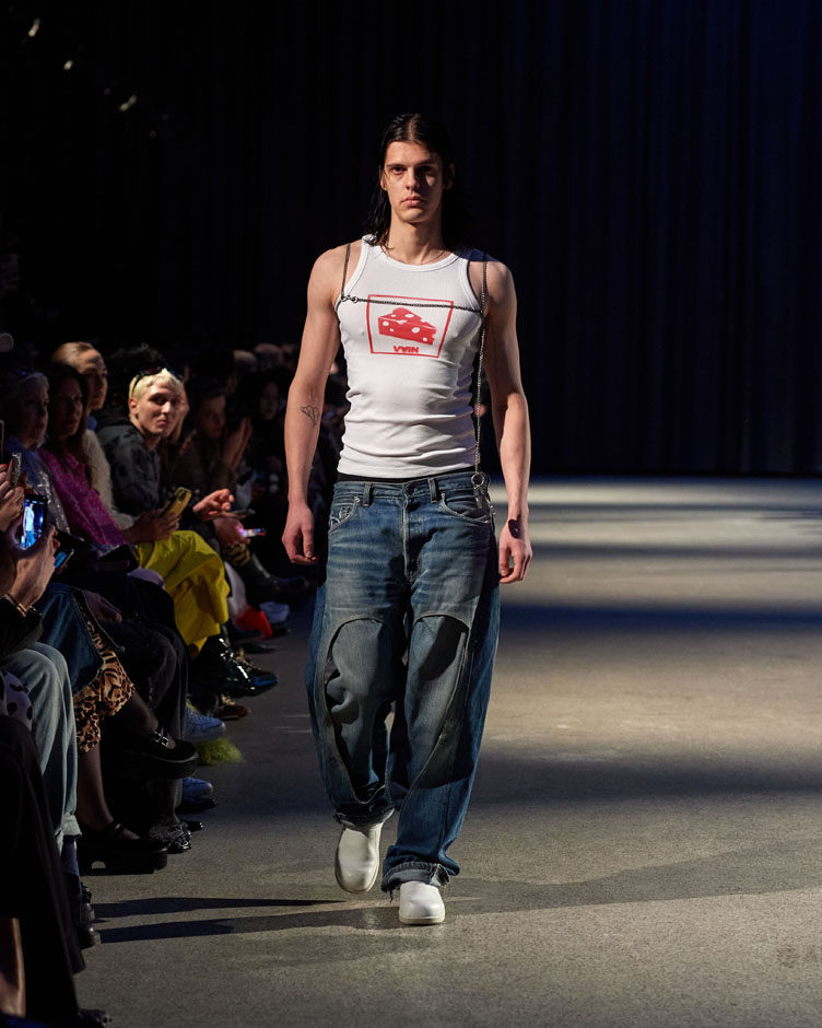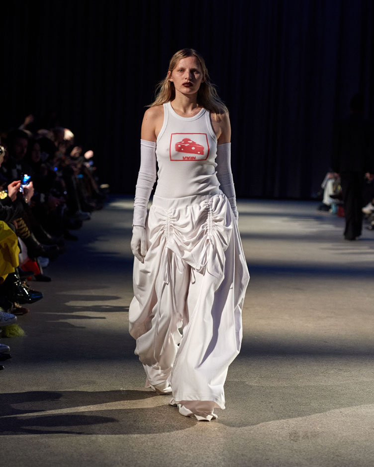 With work life as the broader theme, more concrete inspirations are specifically Helsinki as an environment, Japanese work culture and attire, as well as the 2010 Atlanta trap music era, where rappers used to put out 3-4 mixtapes a year, glamourizing work ethic in a way that still resonates with us. Married to the VAIN showcases silhouettes and accessories that blend elements of formal business attire with the comfort of leisurewear, presenting a fusion of sleek, tailored designs and relaxed streetwear. The garments are rich in symbolism and graphics that reflect the so-called rat race. To solidify the commitment to this life, the collection also includes a wedding ring. The predominant color scheme as typical for VAIN is black, accented by glittery and bright elements that pay homage to contemporary trap music aesthetics. The collection features items from the upcoming “VAIN Upcycled” product line and incorporates a wide range of deadstock materials.