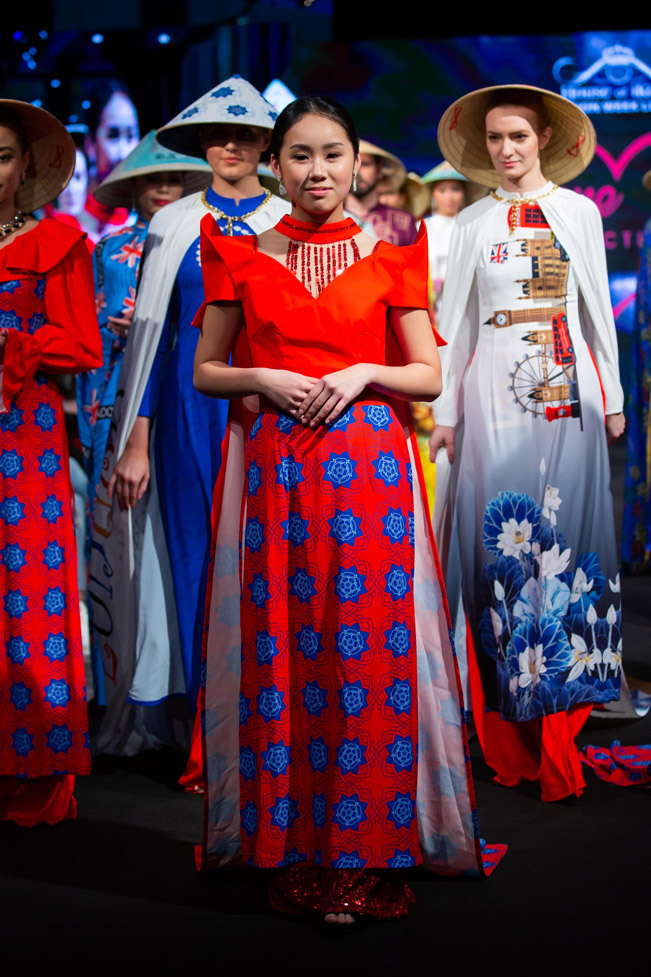 The 13-year-old designer Anna Hoang uses patterns which are icons of the two countries such as lotus, Tudor rose, and famous destinations like Hanoi, Hoi An, Hue, London, Tower Bridge, and Big Ben.