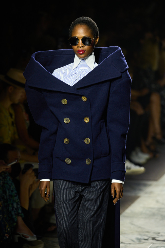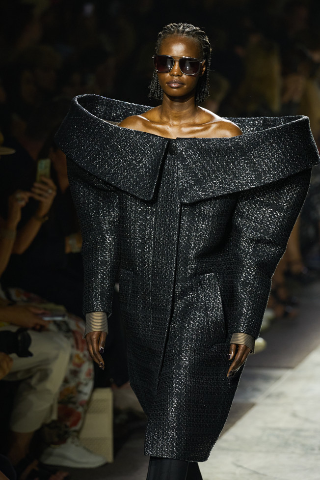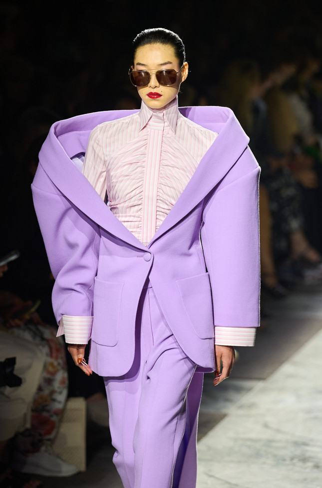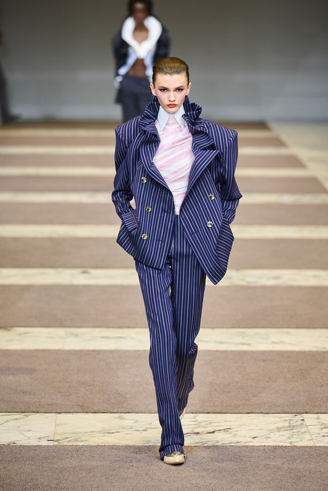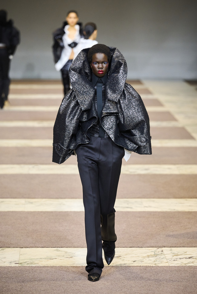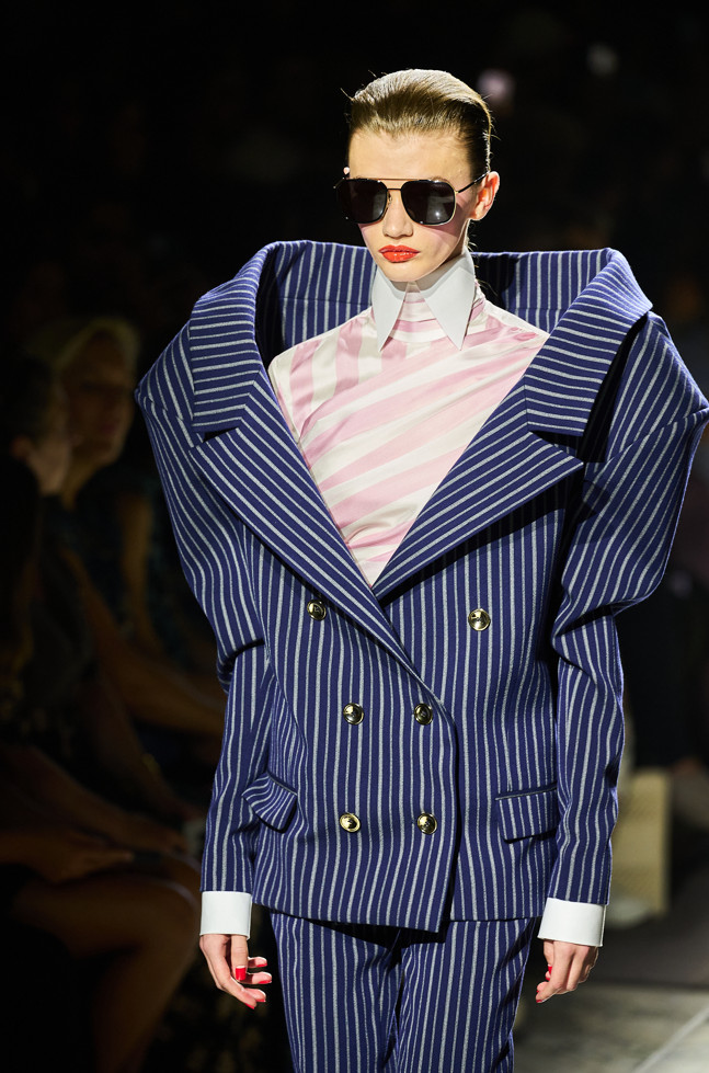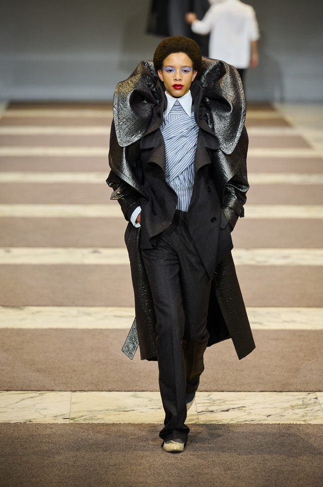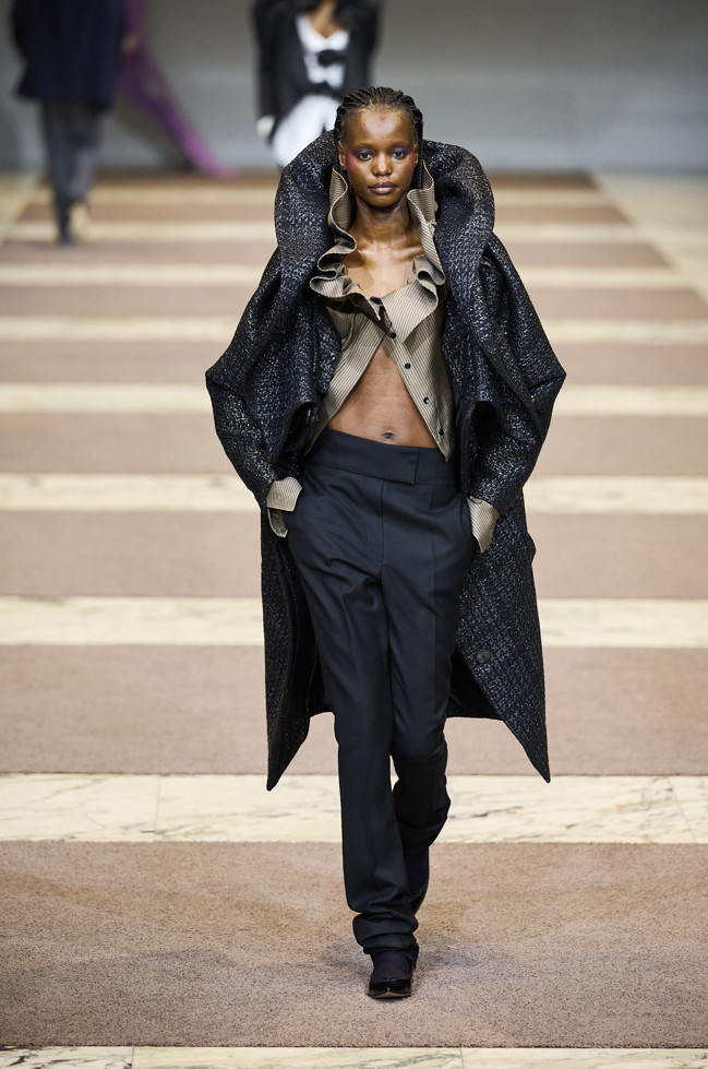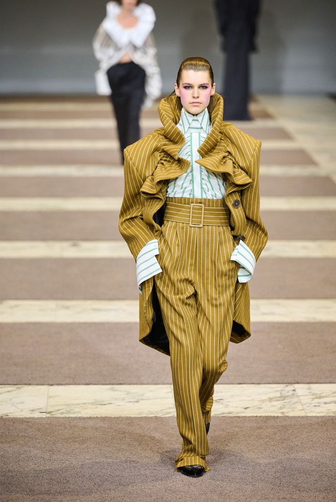 Radically tailored looks strut the grid off the catwalk, like peacocks. Masculine coats, jackets and shirts