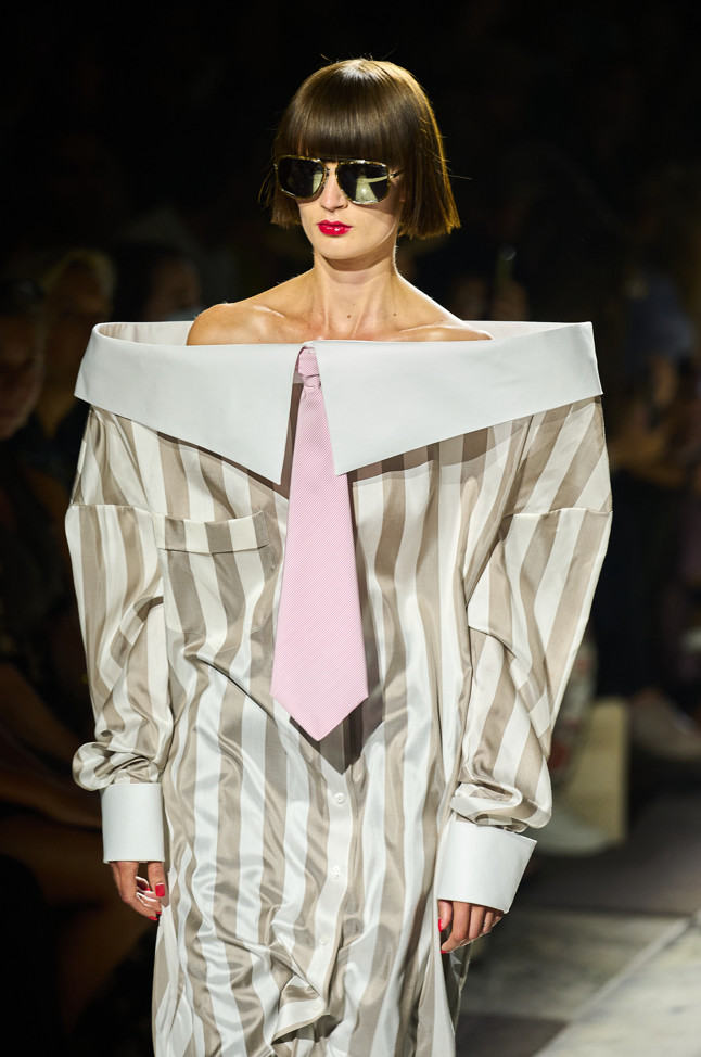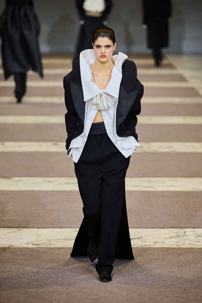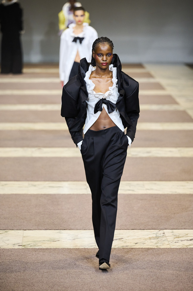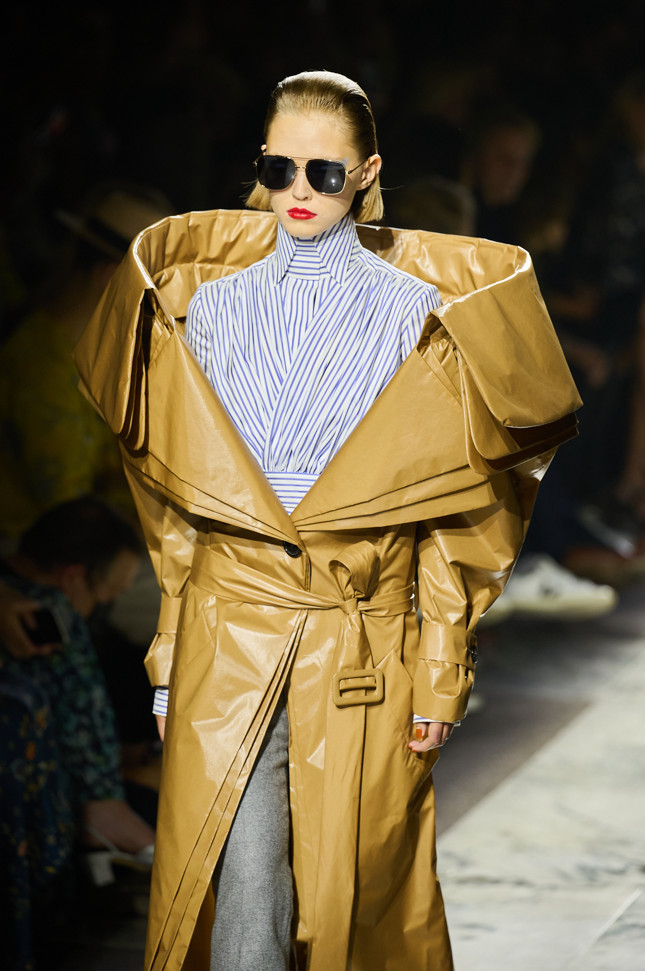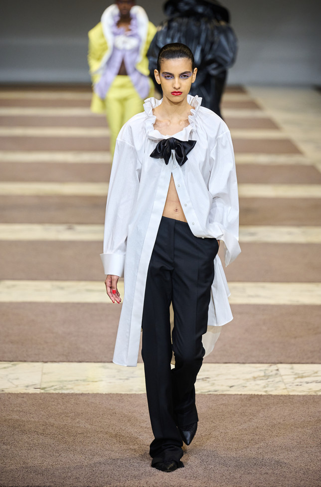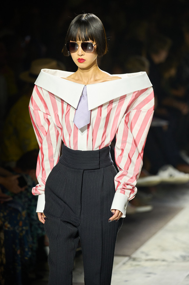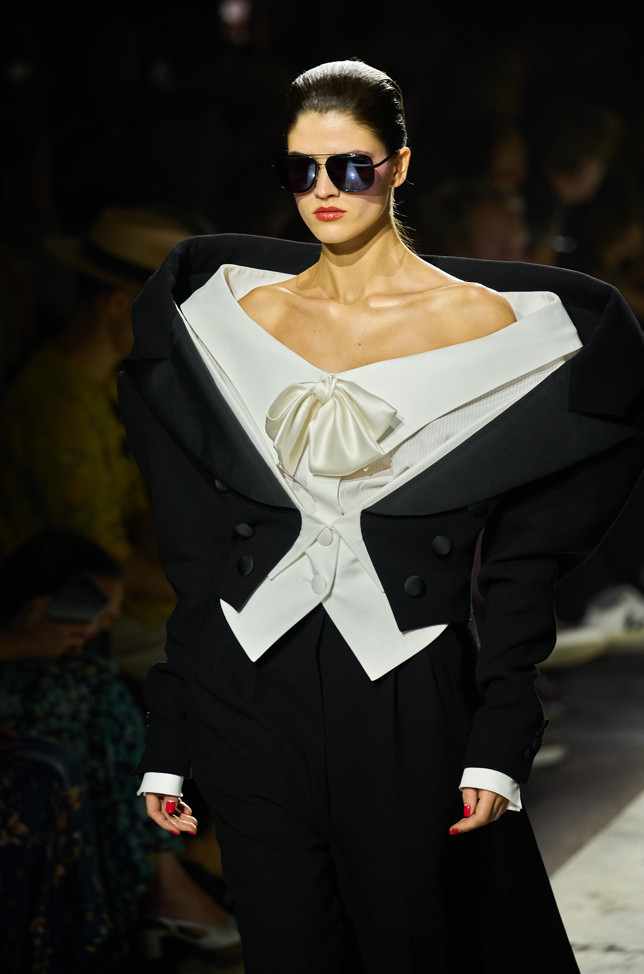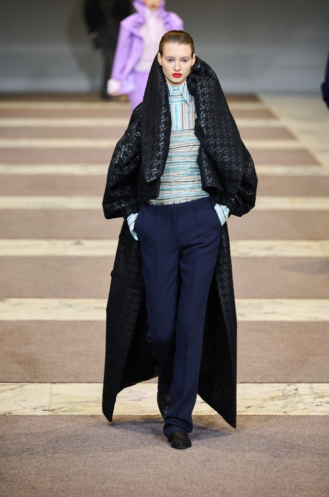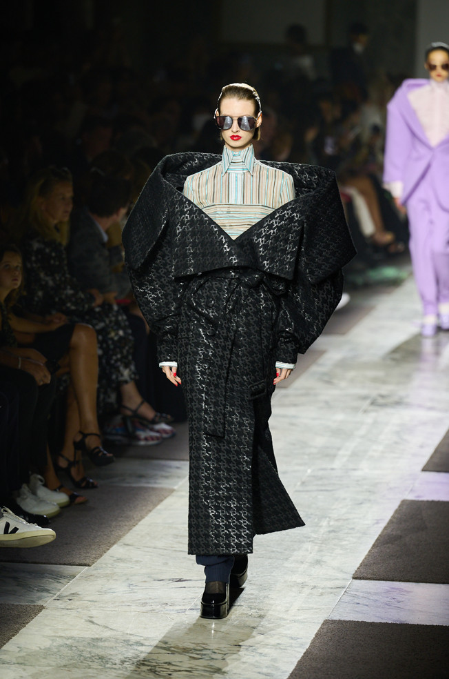 Radically tailored looks strut the grid off the catwalk, like peacocks. Masculine coats, jackets and shirts