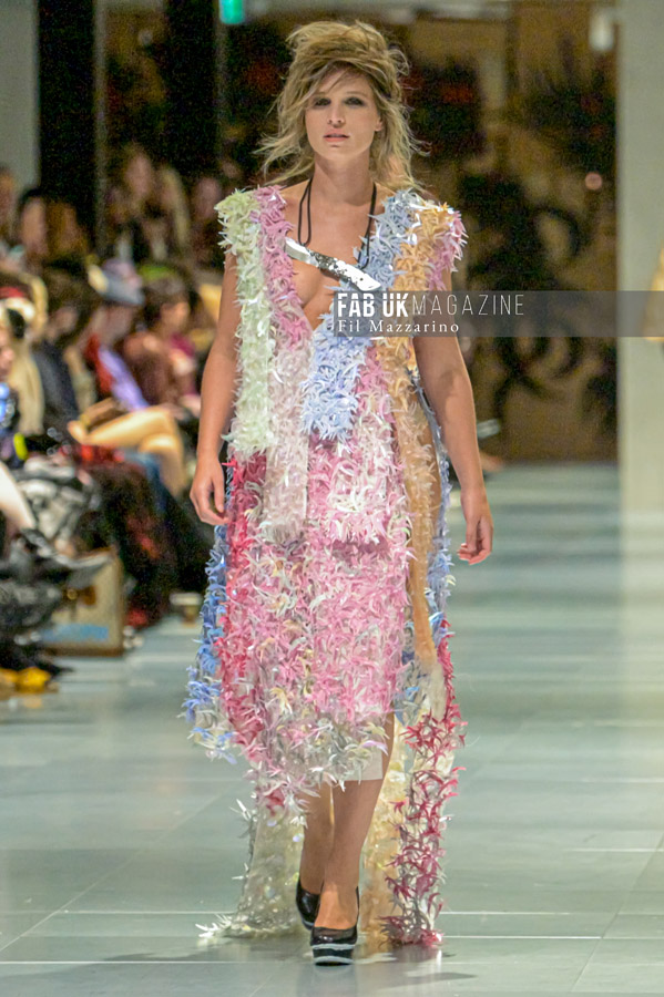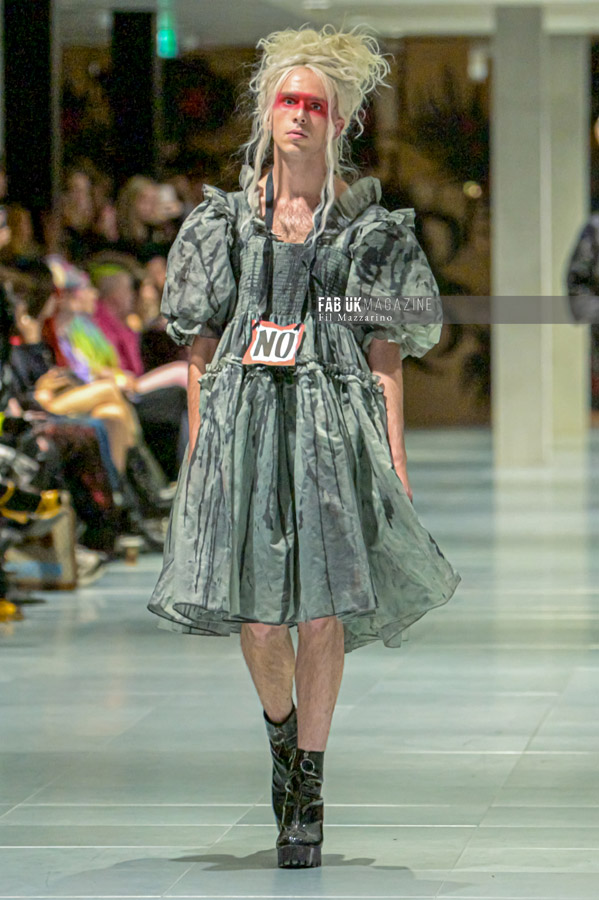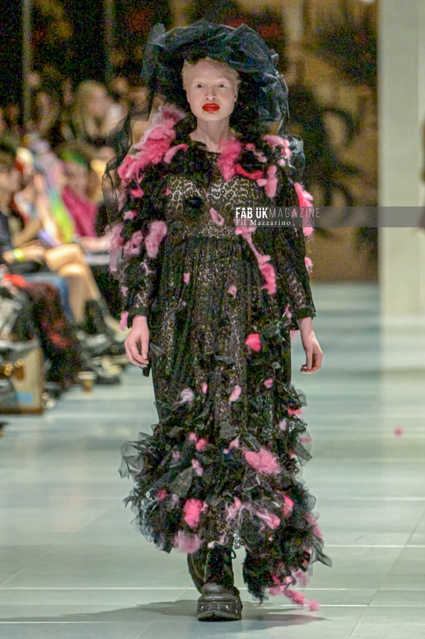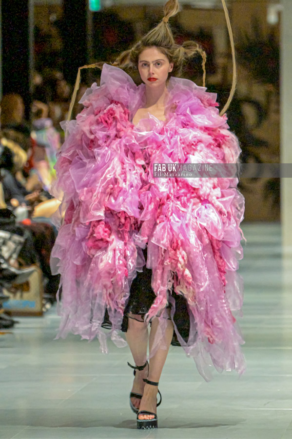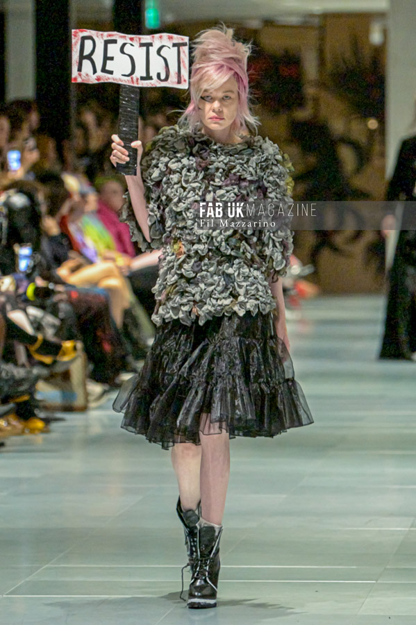 Incorporating a mix of past and new garments, the MOXIE collection featured eco-friendly materials like nettles, recycled waste plastic, and fabrics made from mushrooms and recycled milk cartons. The fashion duo’s work emphasizes not only their inventive textile processes but also their unique role as “ideologists,” using fashion to tell stories of their environmental efforts over the past two decades.