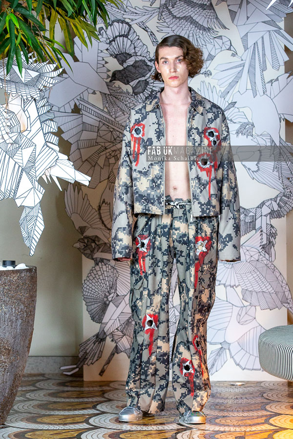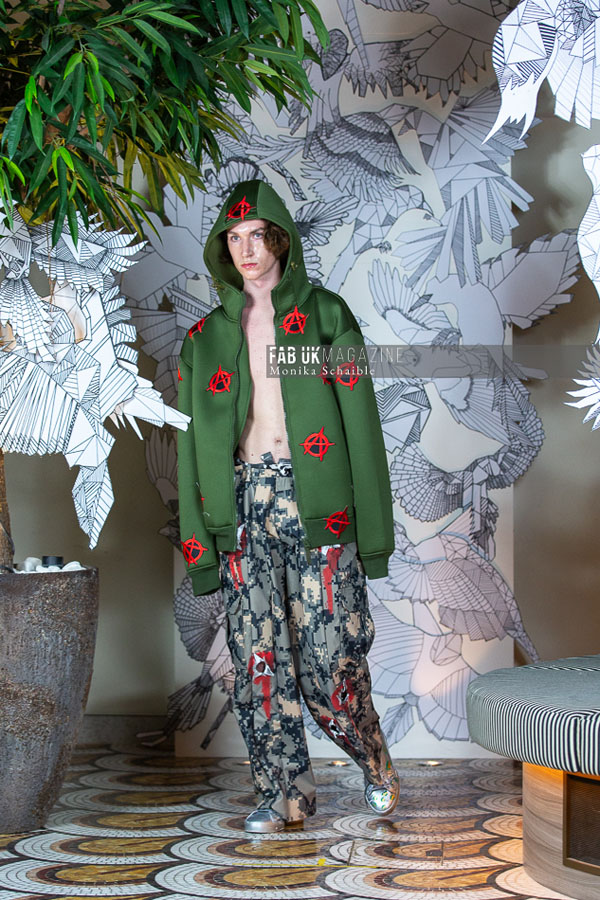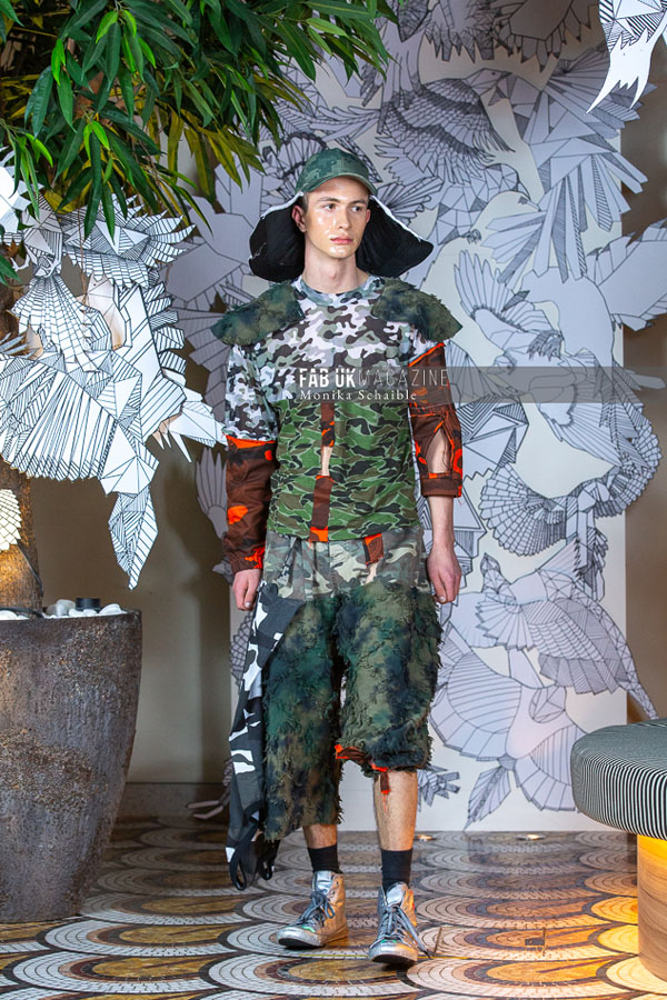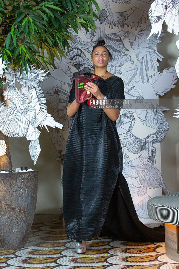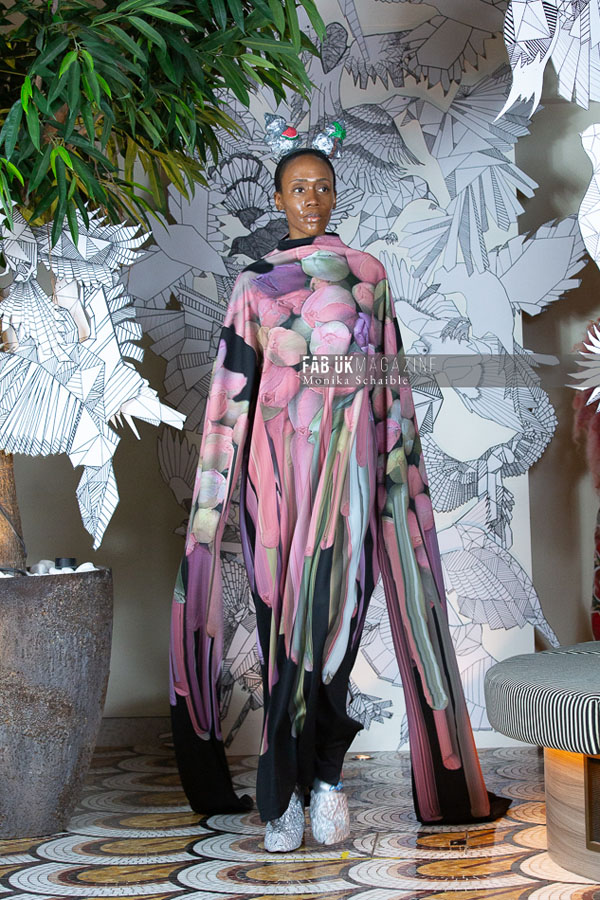 This season, we’re also highlighting our education program, which involves students from six universities worldwide collaborating with us on research and eco-recycling initiatives. Waste from the UK garment industry has been repurposed into outfits featured on the catwalk. Students from UK universities, along with a team from Oxford Brookes University, contribute to production support as part of an educational initiative focused on creative eco-fashion.