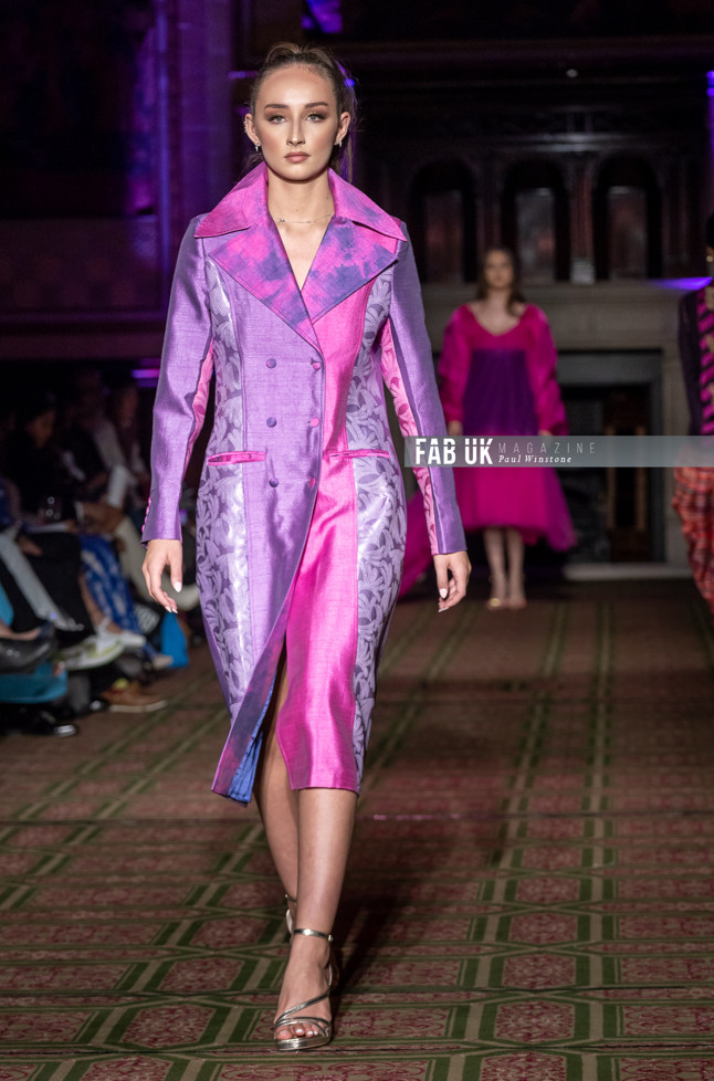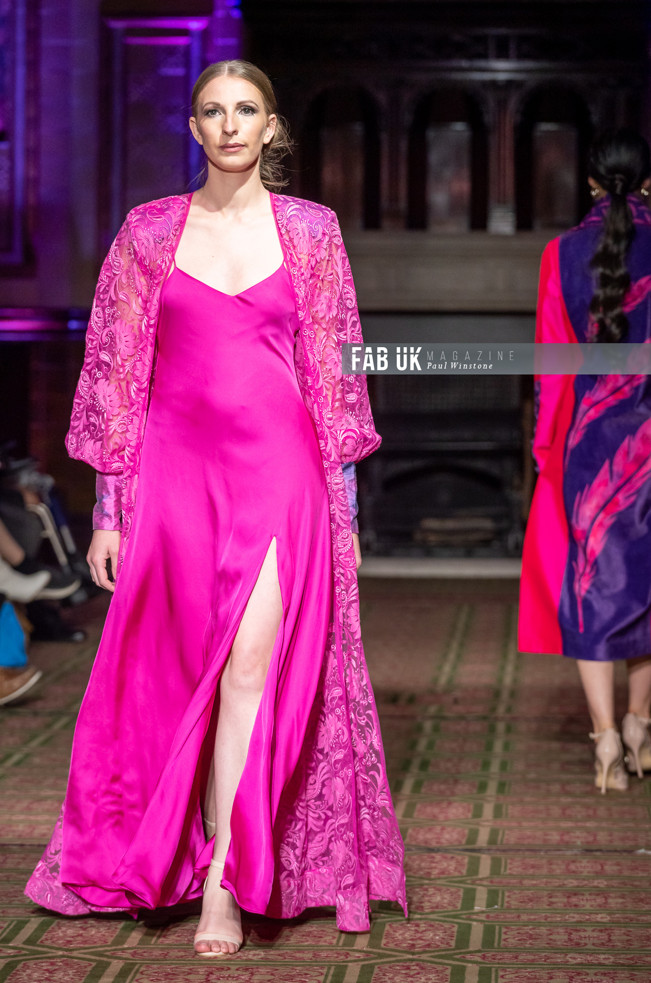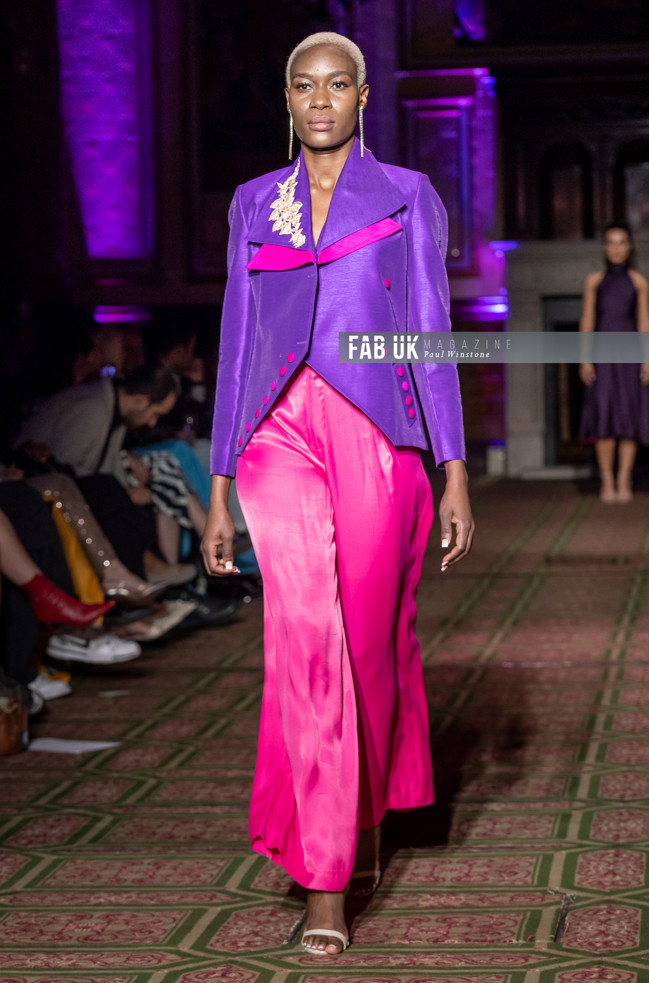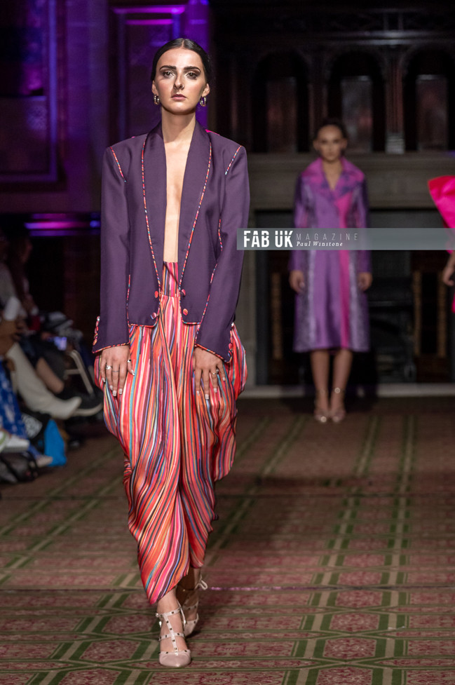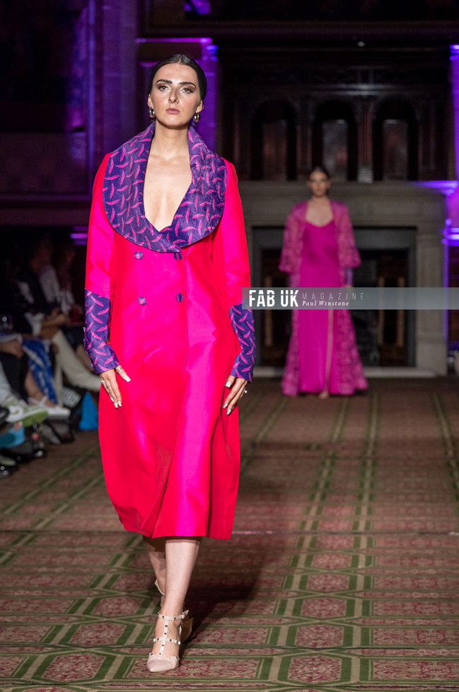 Her show opened with a stunning Hot Pink Silk Jacket complimented by a Digital Printed Velvet Collar, back panel and Cuffs featuring the feather from her brand logo which set the tone for the remainder of her collection.