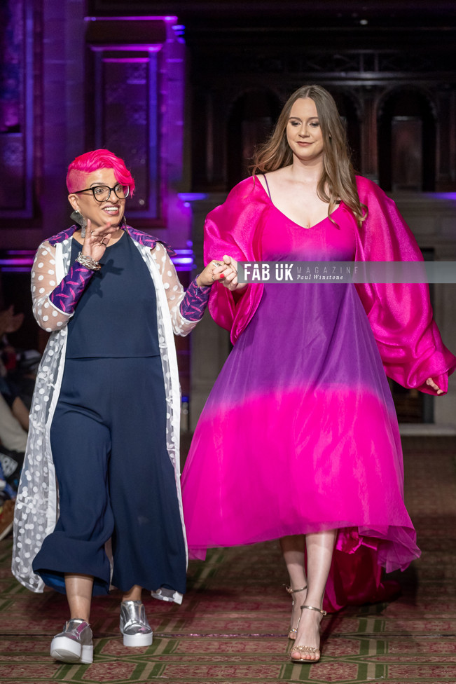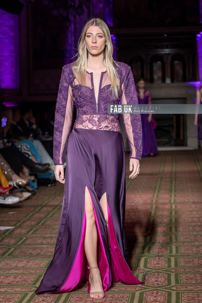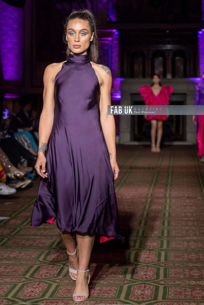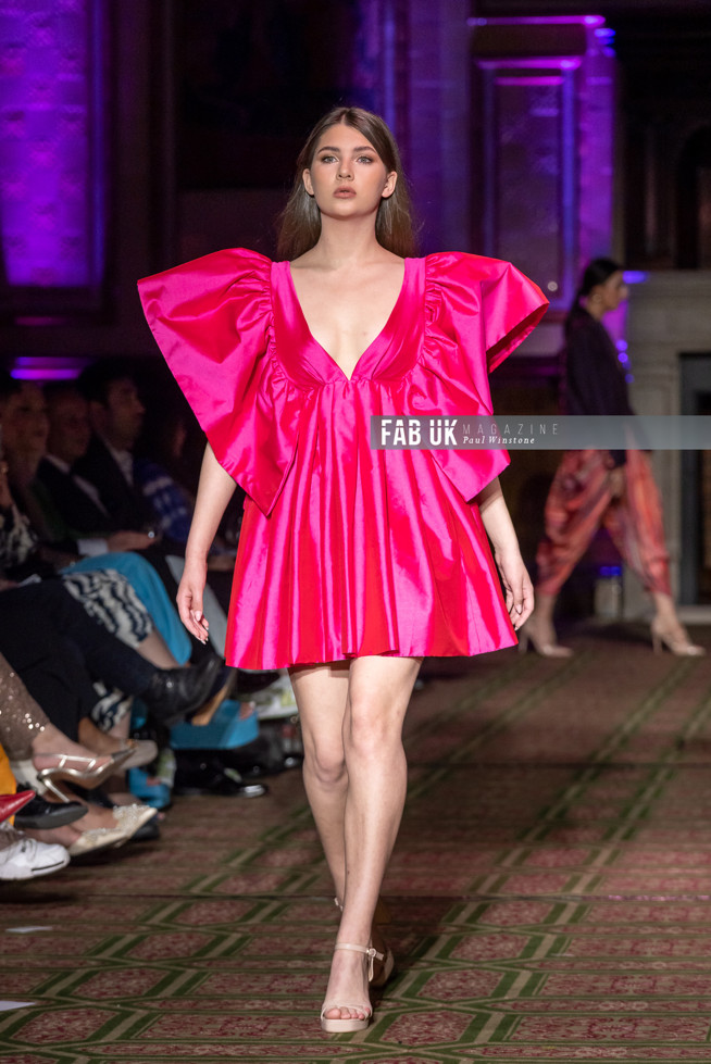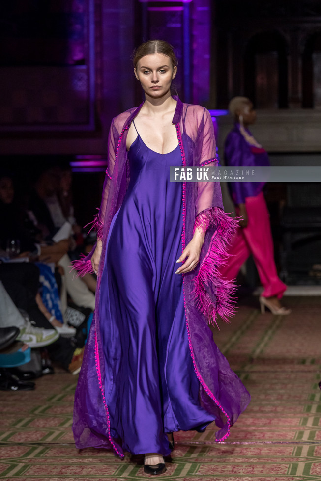 Her show opened with a stunning Hot Pink Silk Jacket complimented by a Digital Printed Velvet Collar, back panel and Cuffs featuring the feather from her brand logo which set the tone for the remainder of her collection.
