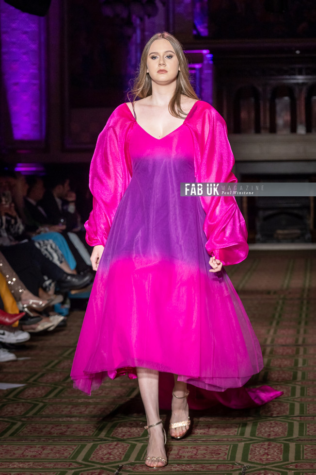 The second dramatic piece was a Jacket with multiple Ombre’ d panels from Satin Silk to Raw Silk to Textured Silk creating a different colour effect from the angel of view instilling the meaning of Iridescence both literally and metaphorically.