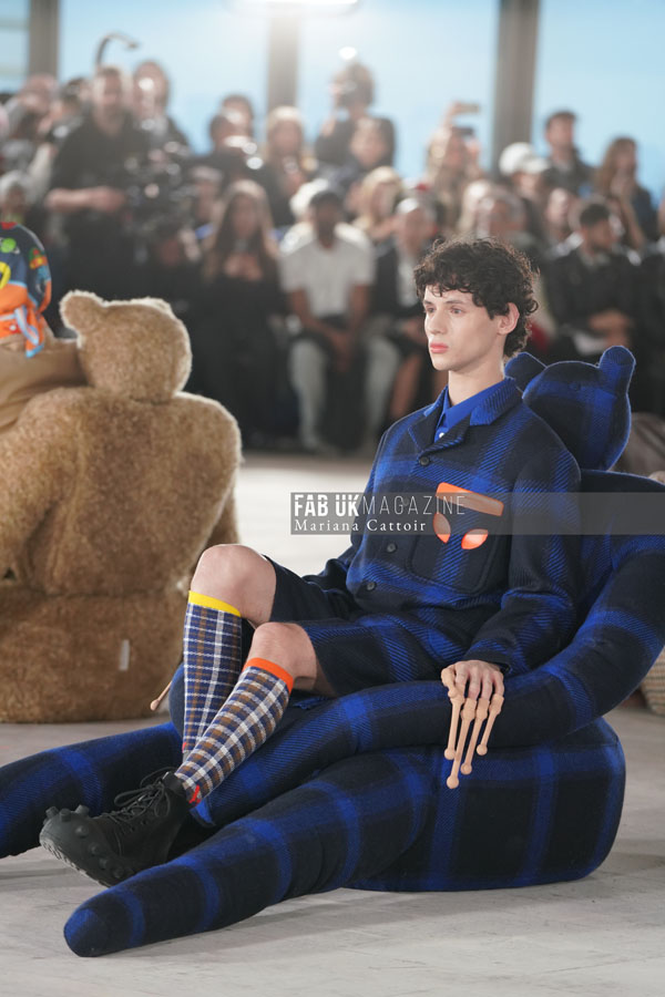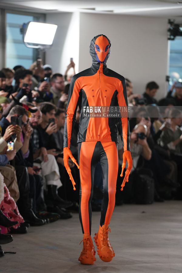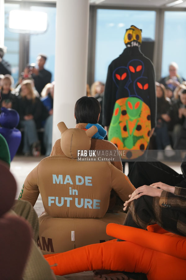 Central to the collection is the imagery of running through sunflower fields with “Alien Friends,” a metaphor for fresh perspectives and possibilities. This dreamlike narrative is realized through unique pieces such as Stephen Jones hats and silicone extraterrestrial fingers, alongside alien-inspired “couches that care for you.”