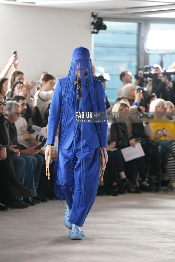 The FW25 collection is a testament to innovation, featuring precise tailoring, high-quality fabrics sourced from English and Scottish mills, and cutting-edge 3D-printed pieces. Beirendonck masterfully blends ancient Dutch craftsmanship with futuristic technology, creating “dented silhouettes” and “cubic” designs that defy convention. AI-generated images further push the boundaries, crafting an otherworldly aesthetic that brings his vision to life.