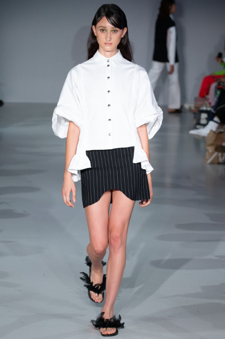 With its geometric designs juxtaposed with fluid and soft lines, the SS20 collection is composed of architectural and draped pieces. Expert gathering, bias cutting and off the body tailoring creates idiosyncratic: classical forms, minimalist shapes and voluminous silhouettes. Bold experimentation creates memorable designs with: sculptured wavy sleeves, cut-outs, architectural shapes, unorthodox bustier corsets, prints with all over landscape painting and knitwear dresses, jumpers, tops and skirts are made using innovative knitting techniques.