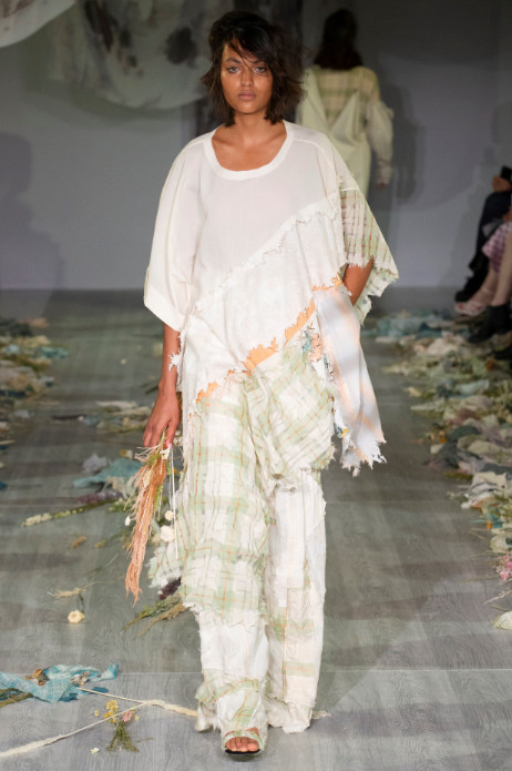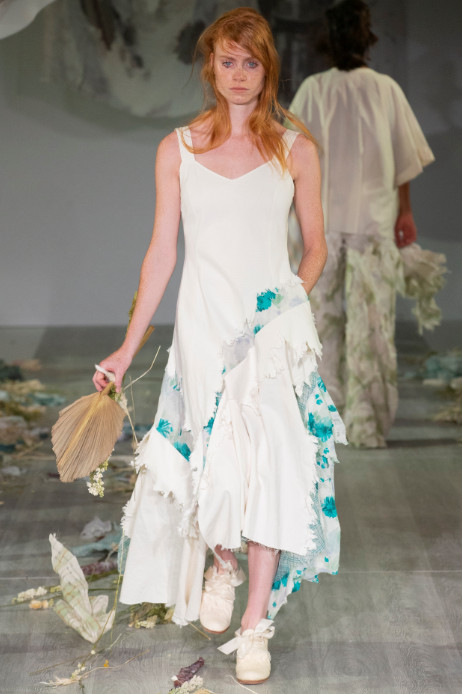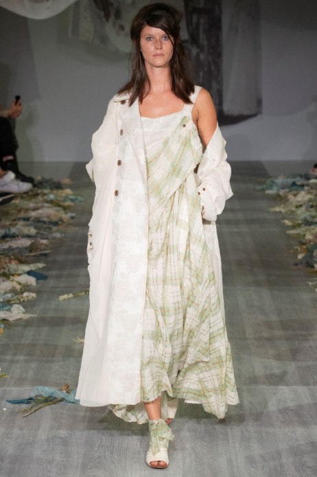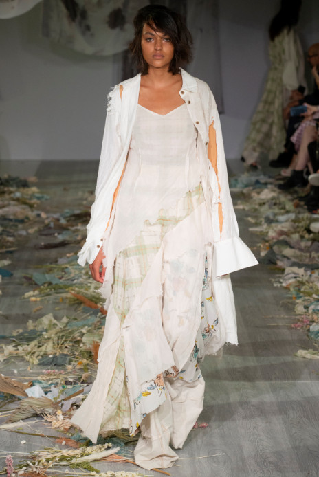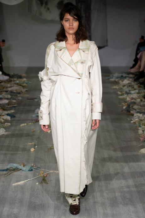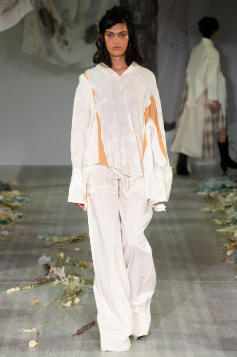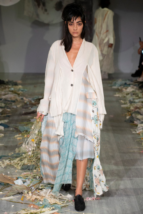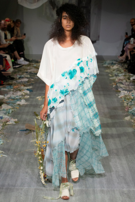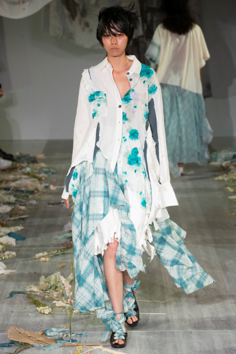 The brand explores the beauty of brokenness, traces of human presence, Chinese ancient recluses and the 1990 grunge. The SS20 collection returns with contrasting floral prints and textures, mixing fragile linen layers and sheer silk fabrics with rough cotton drapery and asymmetric cutting. Wen continues using utility wear with workwear detailing in a palette of muted greens and faded sandy cream.