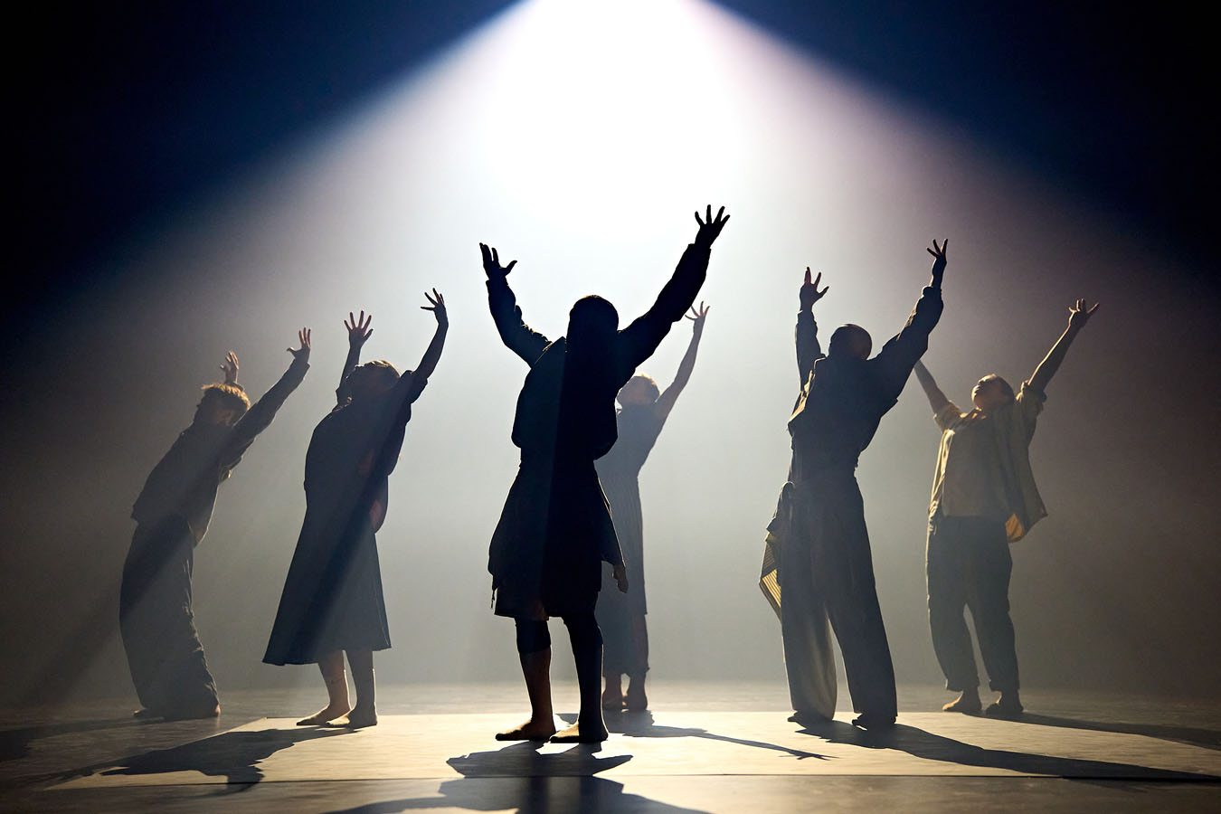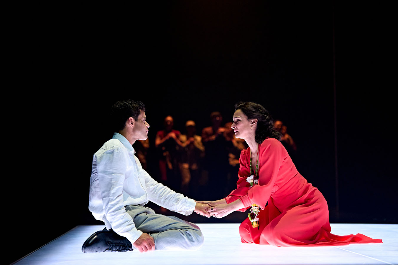 So for 100 minutes straight thru with no interval The Old Vic presents Oedipus. It all starts out very dramatic: a shadow of a face on the front of the opening curtain, then freestyle dancers take to the stage to set up the drama and tension, and when the actors appear you can feel the audience holding their breathe. On a bare bones stage, the story unravels – it’s pretty much all about the acting. And the acting is fine, they are all very relaxed and suited to their roles. And we the audience are the townspeople who listen to Oedipus (Rami Malek), who has just become leader of Thebes – a drought stricken city, and he tells us that there will be water soon.